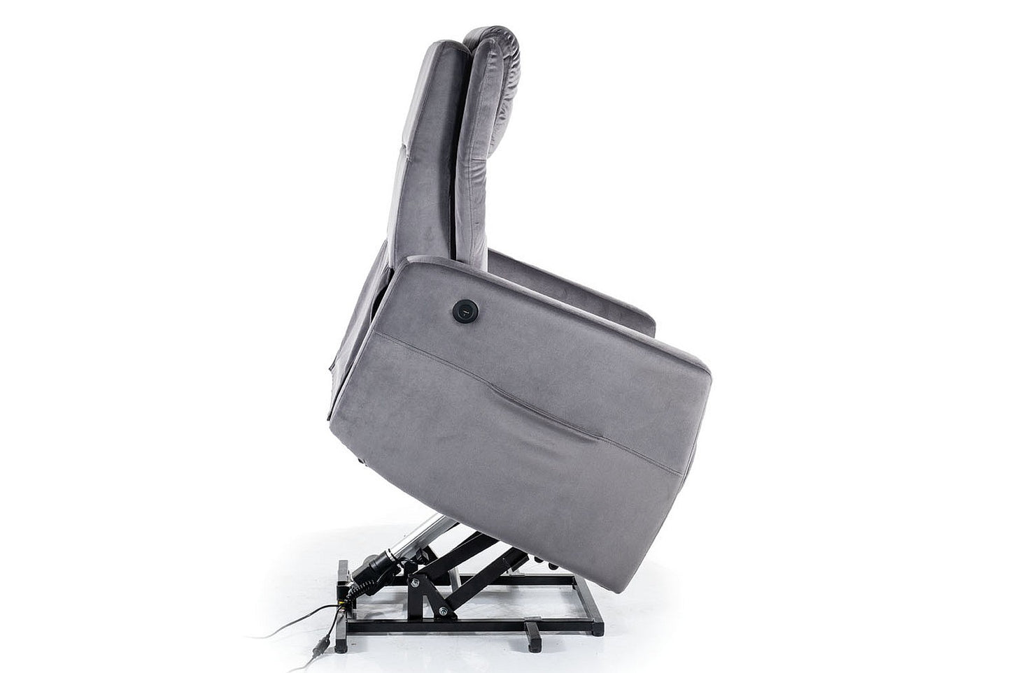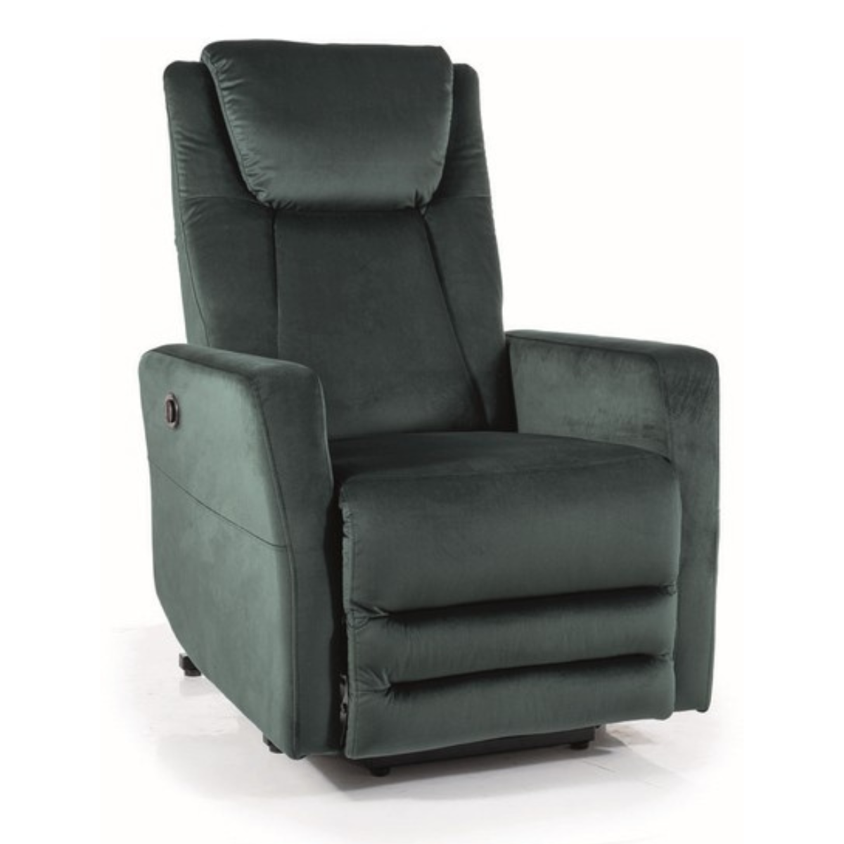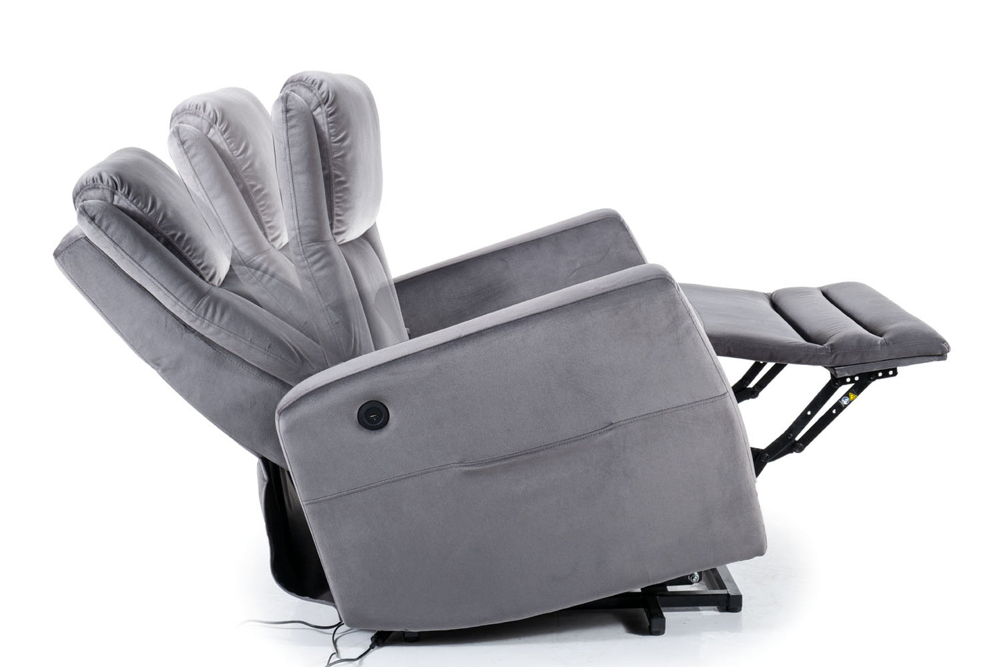 Elektriskais atzveltnes krēsls, regulējams galvas balsts, samta audums, krāsa: zaļa. Vadu tālvadības pults, lai kontrolētu sēdekļa atlocīšanu, kabatu un USB uzlādes ligzdu labajā pusē.