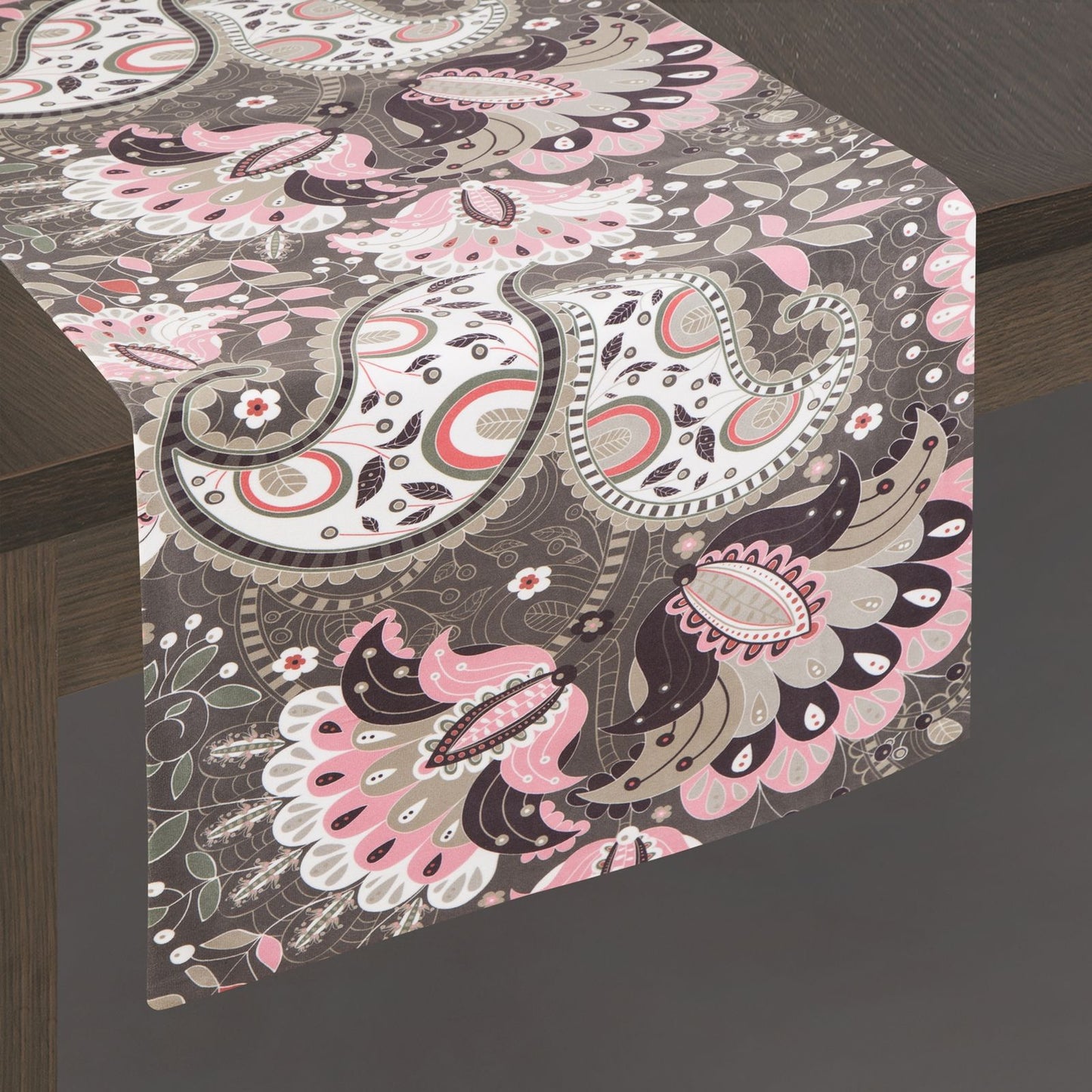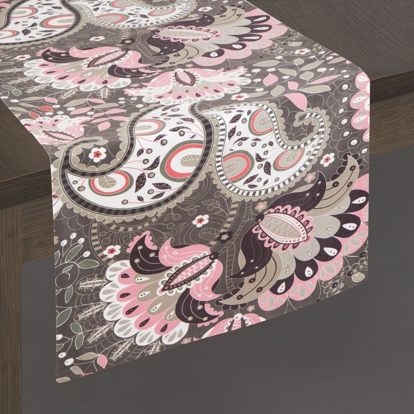 Elegants skrejceļš, kas izgatavots no mīksta un pieskārieniem patīkama samta auduma, rotāts ar krāšņu ziedu apdruku. Gludiniet kreisajā pusē. Platums: 35 cm, garums: 180 cm, krāsa: melna, svars: 260 GSM, sastāvs: Materiāls: 100% poliesteris.
