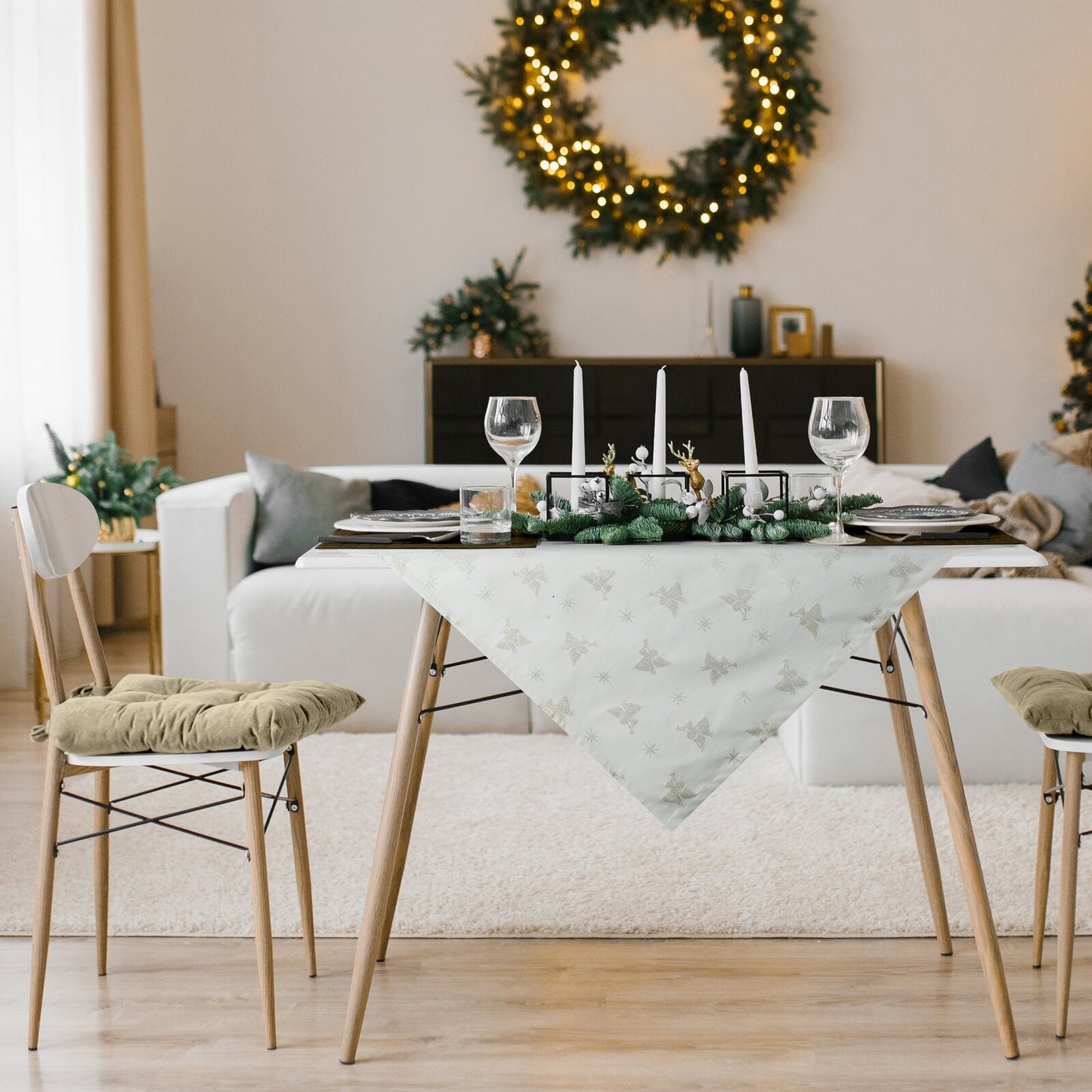 Spīdīgs galdauts ar Ziemassvētku motīvu platums: 40 cm, garums: 180 cm, krāsa: šampanieša, sastāvs: Sastāvs: 65% poliestera, 27% kokvilnas, 8% metālisku diegu.