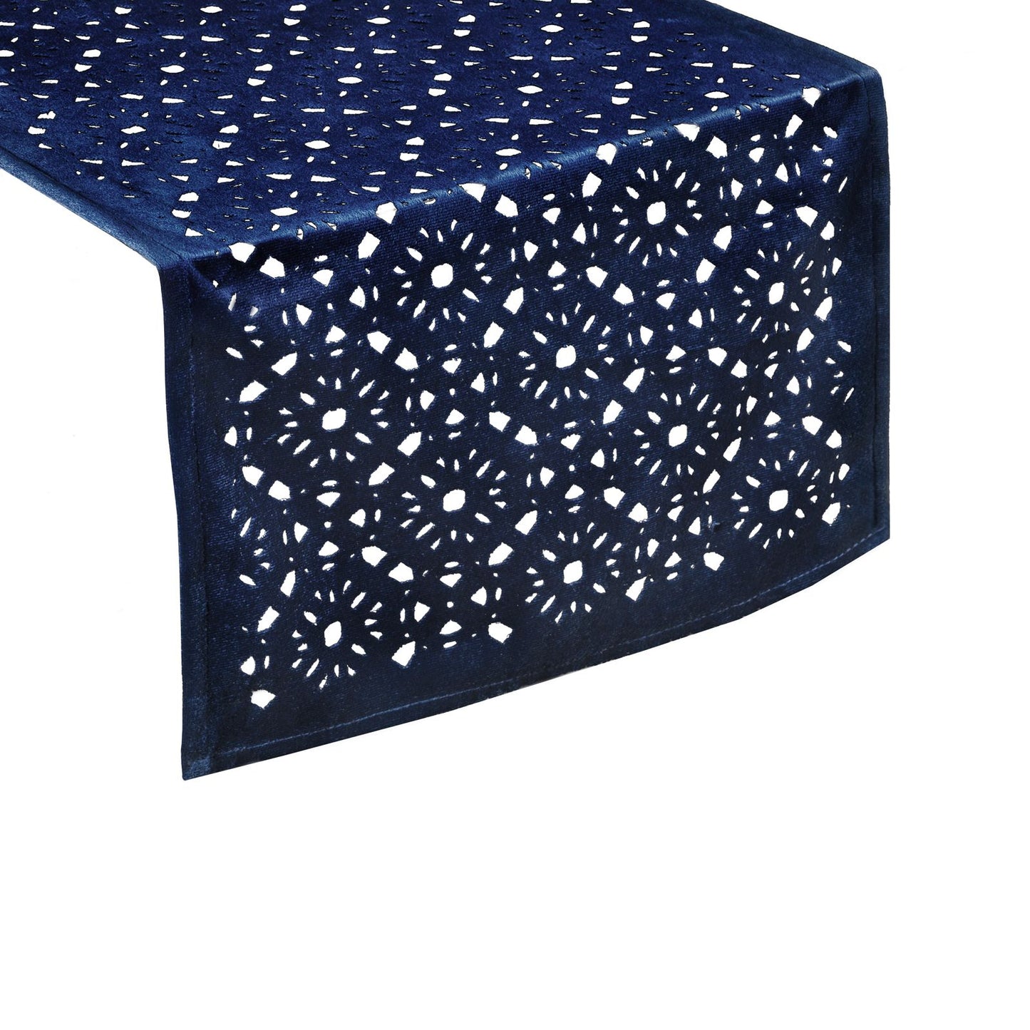 Ārkārtīgi izteiksmīgs samta pārklājums, kas izceļas ar lāzera griezumu veidotu ažūru rakstu, kas klāj visu virsmu. Plašums: 33 cm, garums: 180 cm, krāsa: tumši zila, svars: 200GSM GSM, sastāvs: Sastāvs: 100% poliesteris.