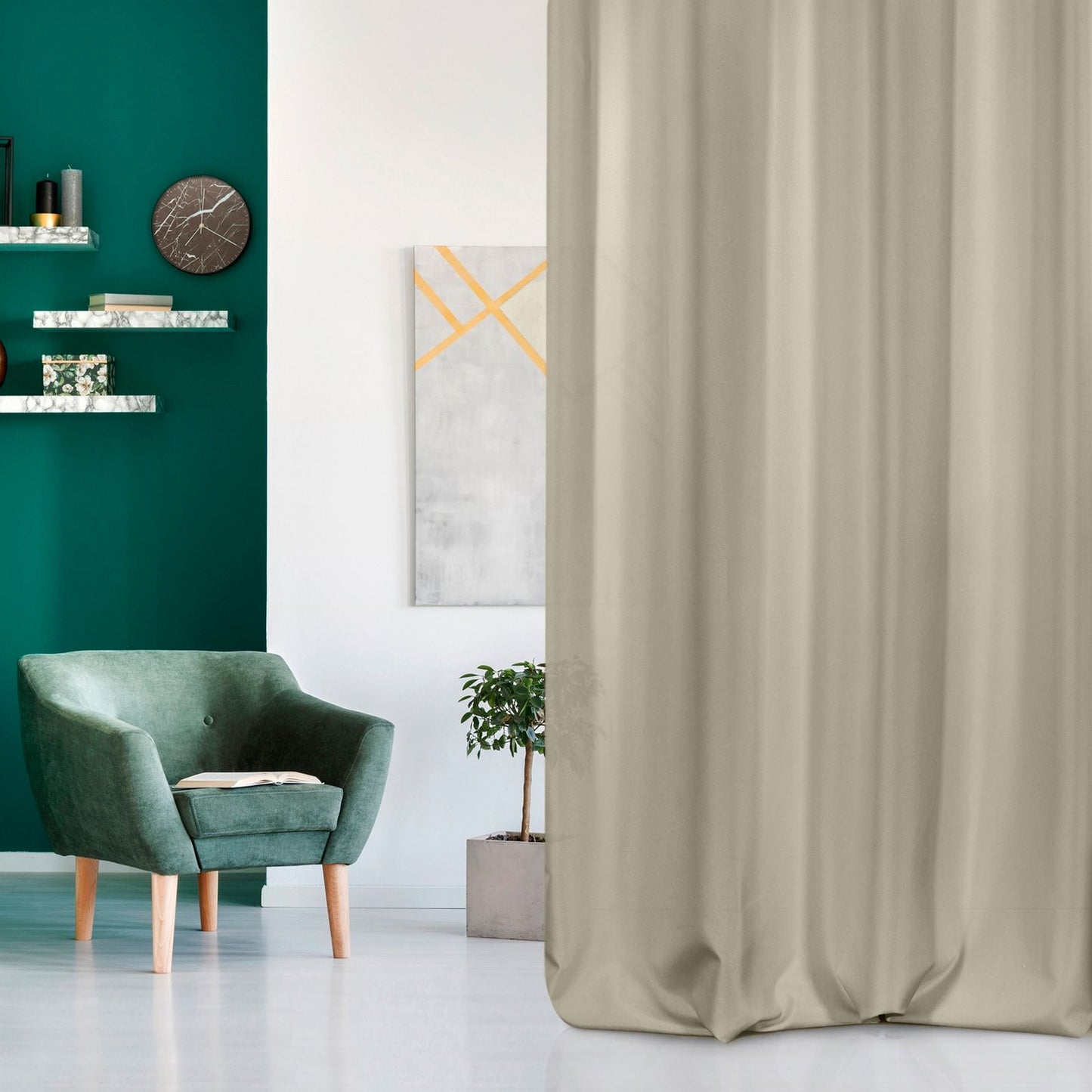 Skaists vienkrāsains mīksta auduma aizkars ar matētu apdari un satīna pinumu. Universāls dekors jebkuram interjeram. Viegli gludināms. Platums: 140 cm, garums: 250 cm, krāsa: krēmkrāsa, svars: 140 GSM, sastāvs: Sastāvs: 100% poliesteris.