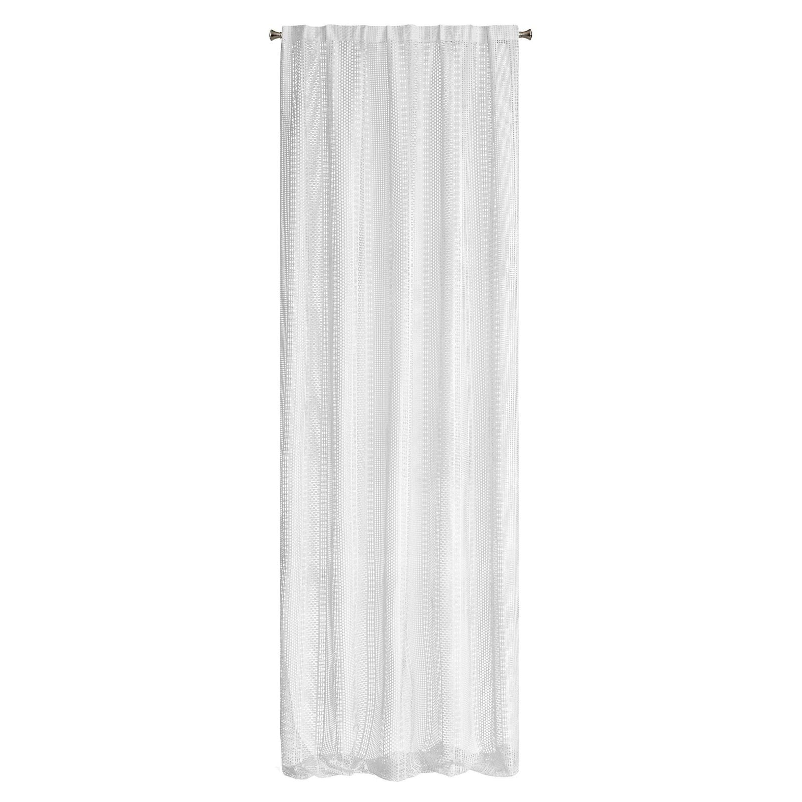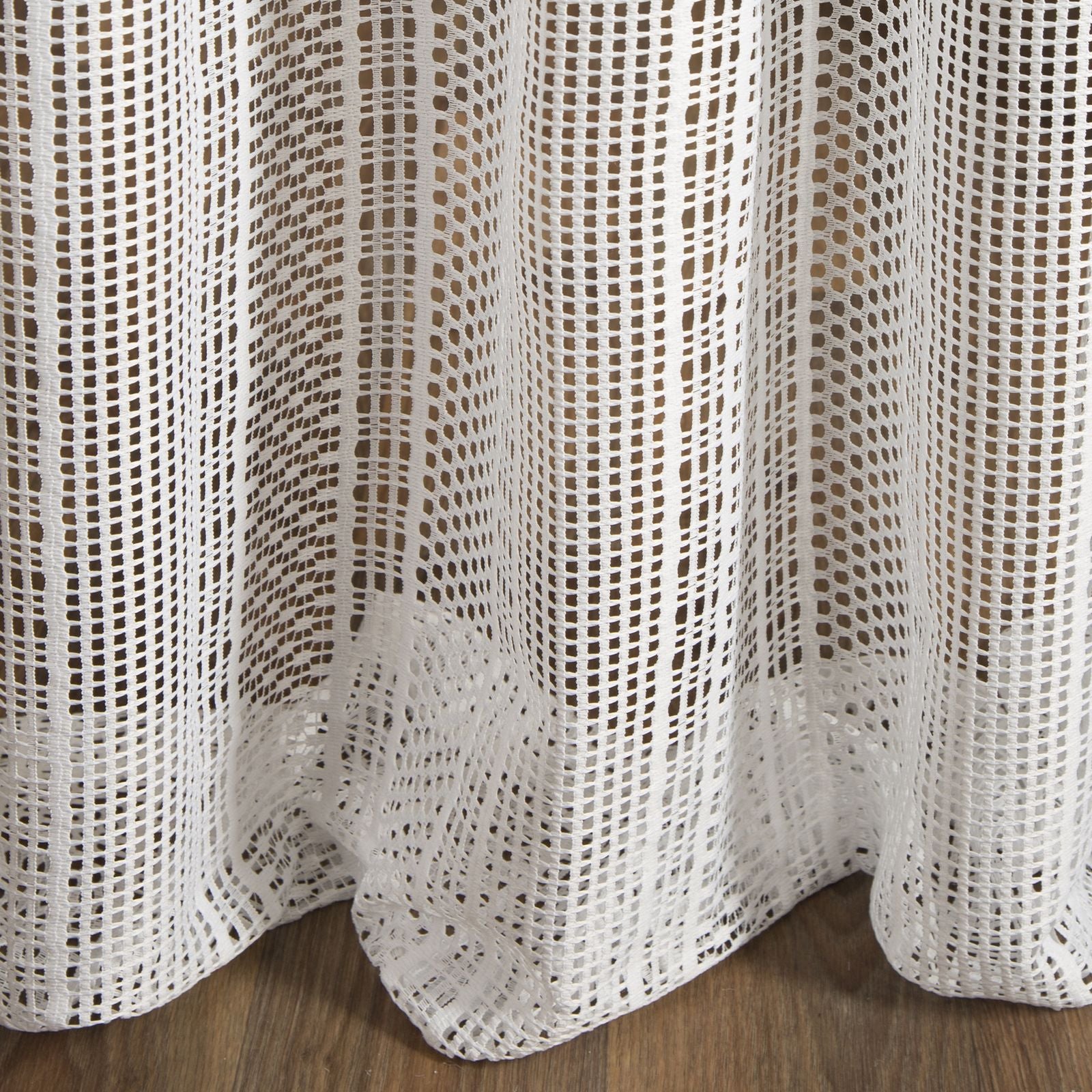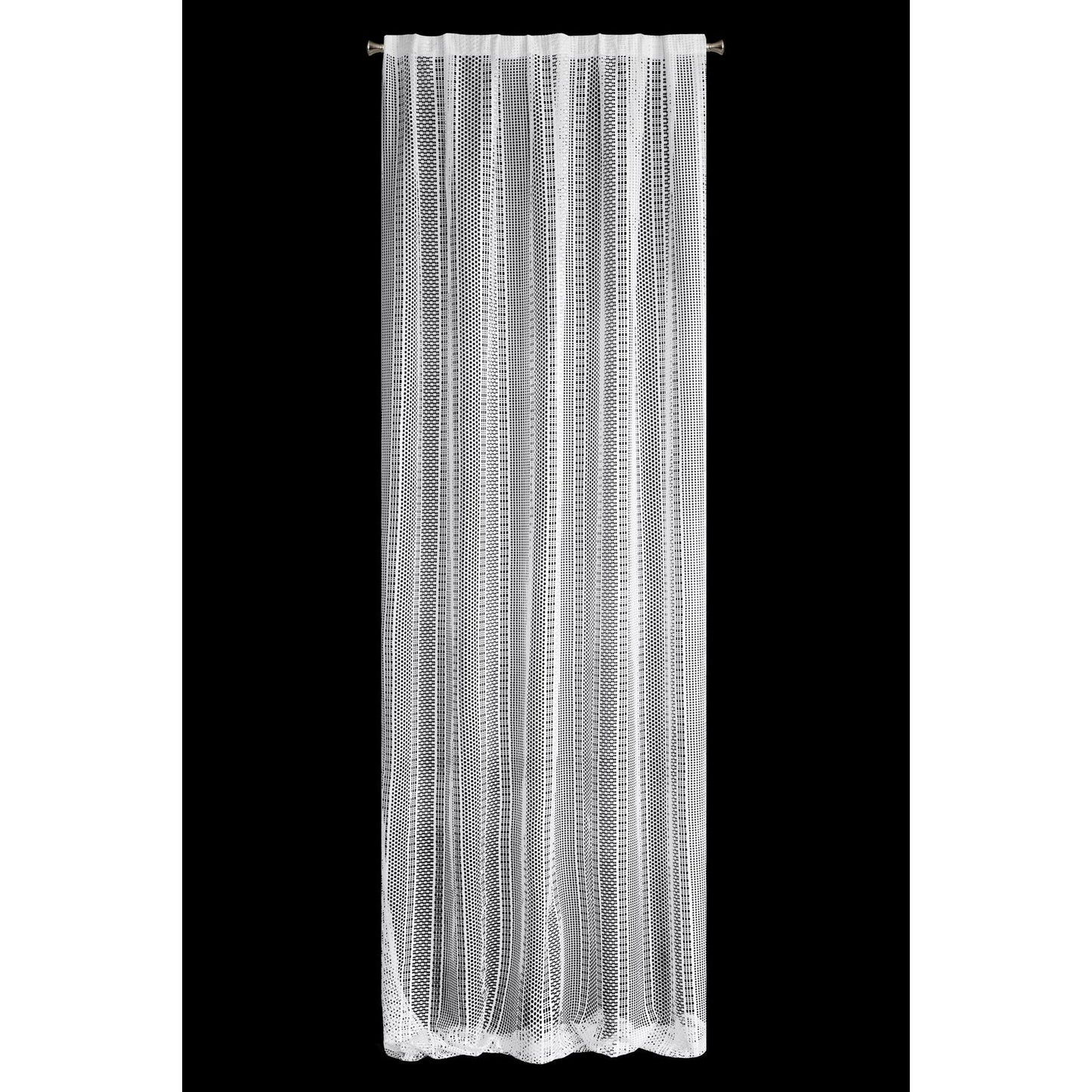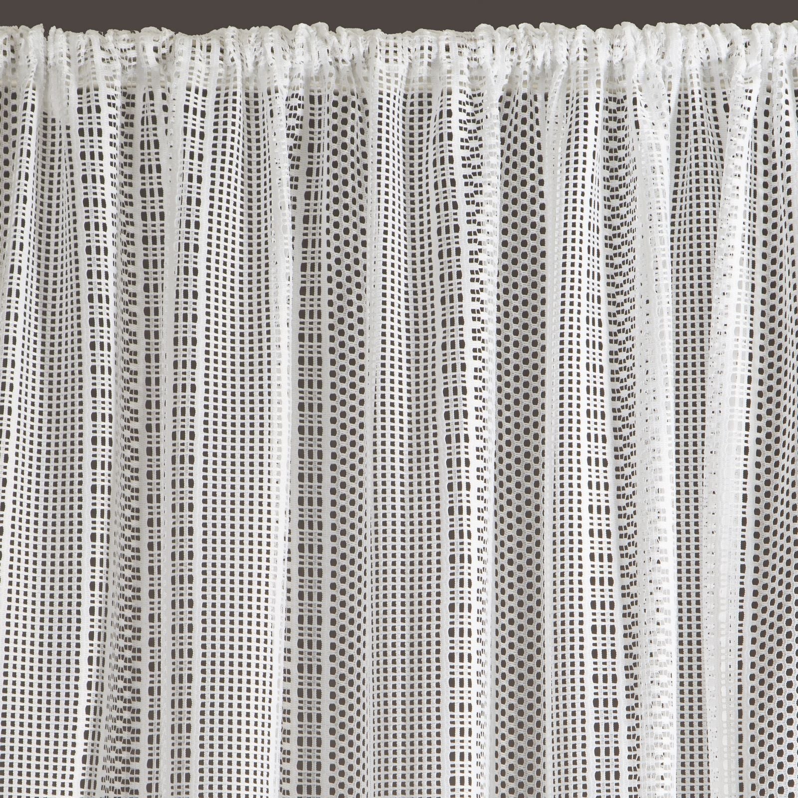Oriģināls logu rotājums, kas izgatavots no auduma ar sieta struktūru. Dažāda izmēra sieti ir izkārtoti vertikālās svītrās, kas vēl vairāk izceļ faktūru. Platums: 140 cm, garums: 270 cm, krāsa: balta, svars: 140 GSM, sastāvs: Sastāvs: 100% poliesteris.