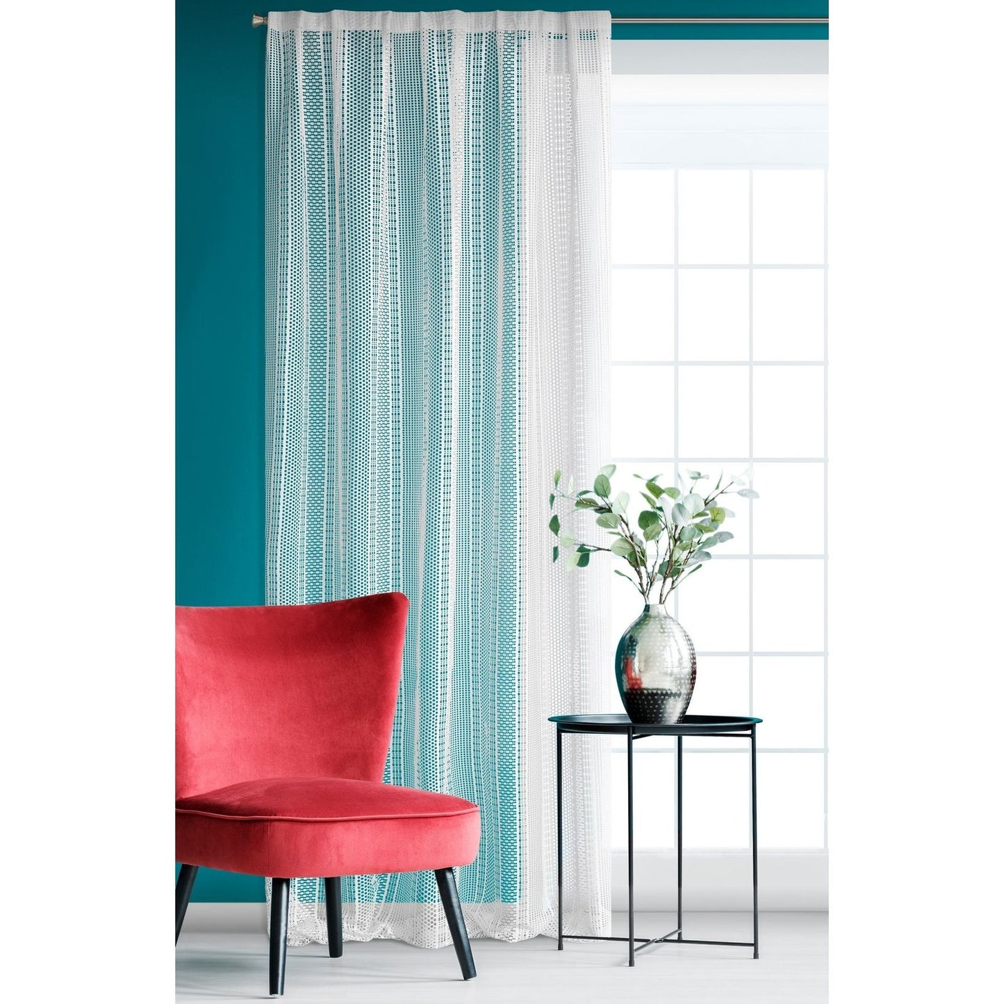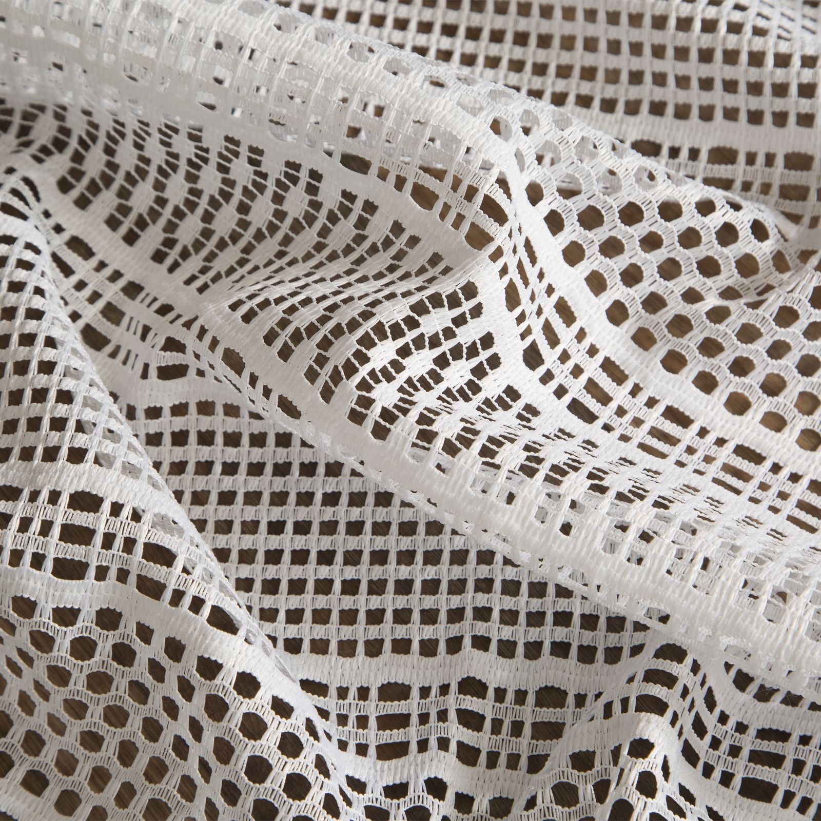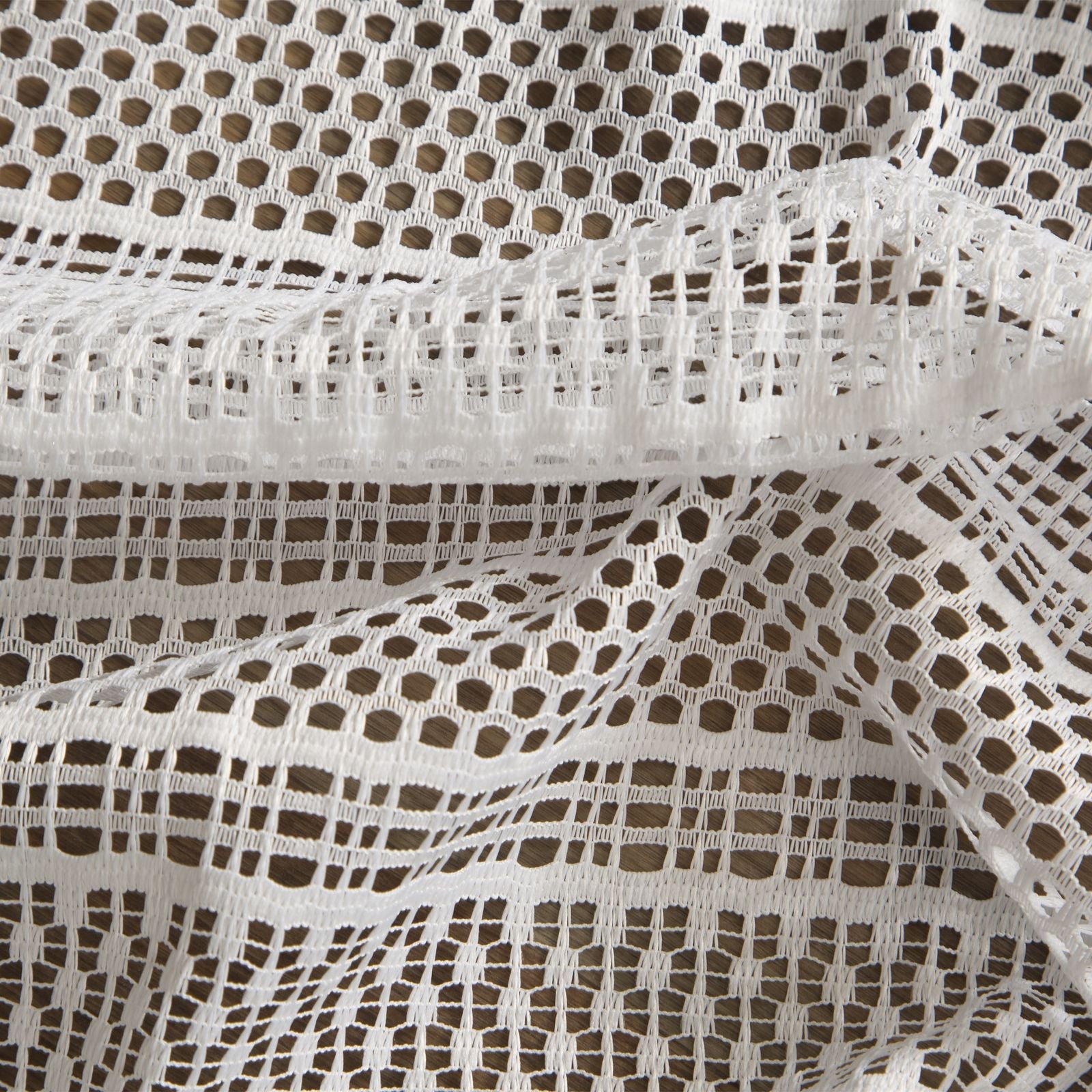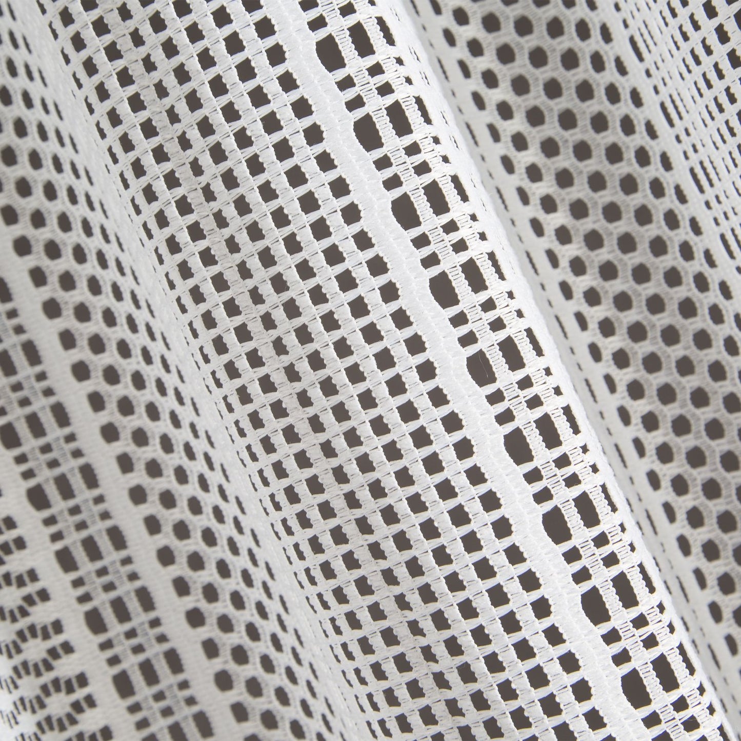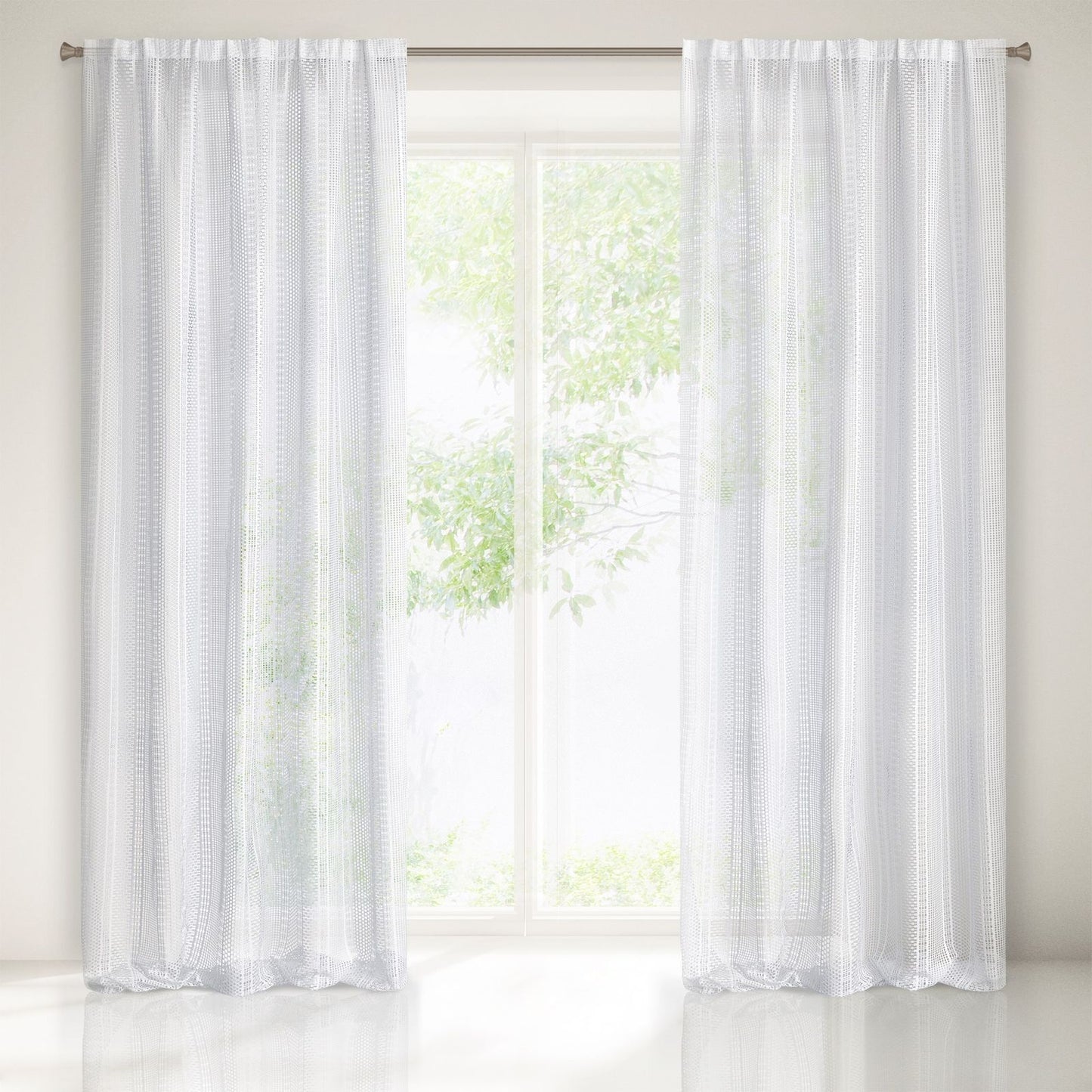 Oriģināls logu rotājums, kas izgatavots no auduma ar sieta struktūru. Dažāda izmēra sieti ir izkārtoti vertikālās svītrās, kas vēl vairāk izceļ faktūru. Platums: 140 cm, garums: 270 cm, krāsa: balta, svars: 140 GSM, sastāvs: Sastāvs: 100% poliesteris.