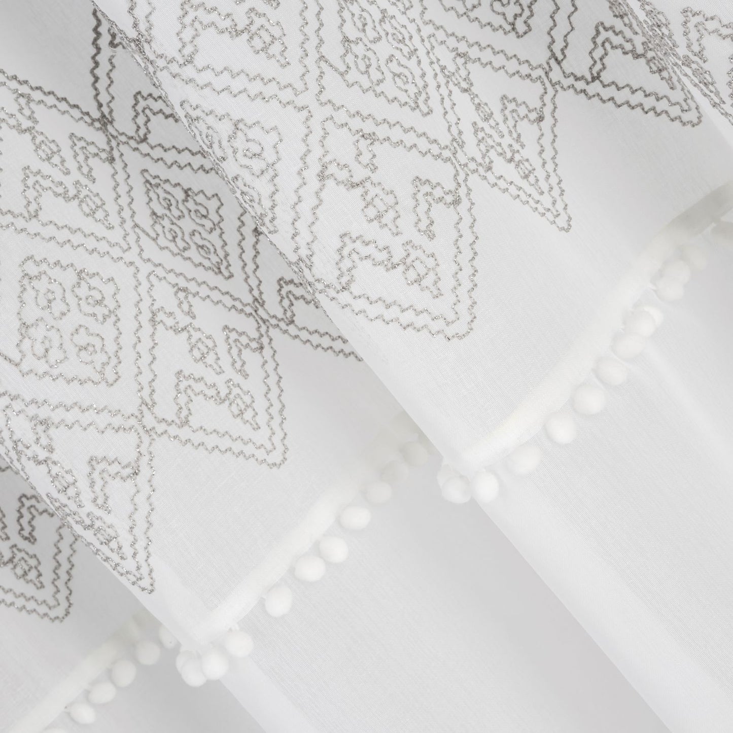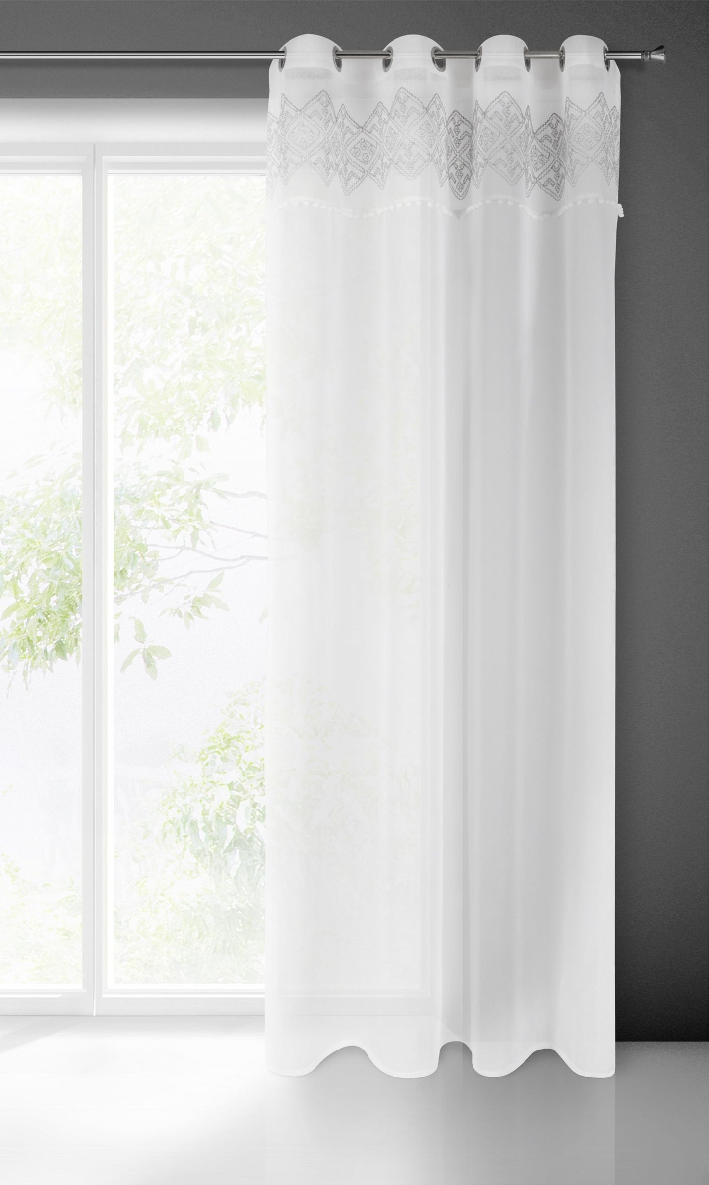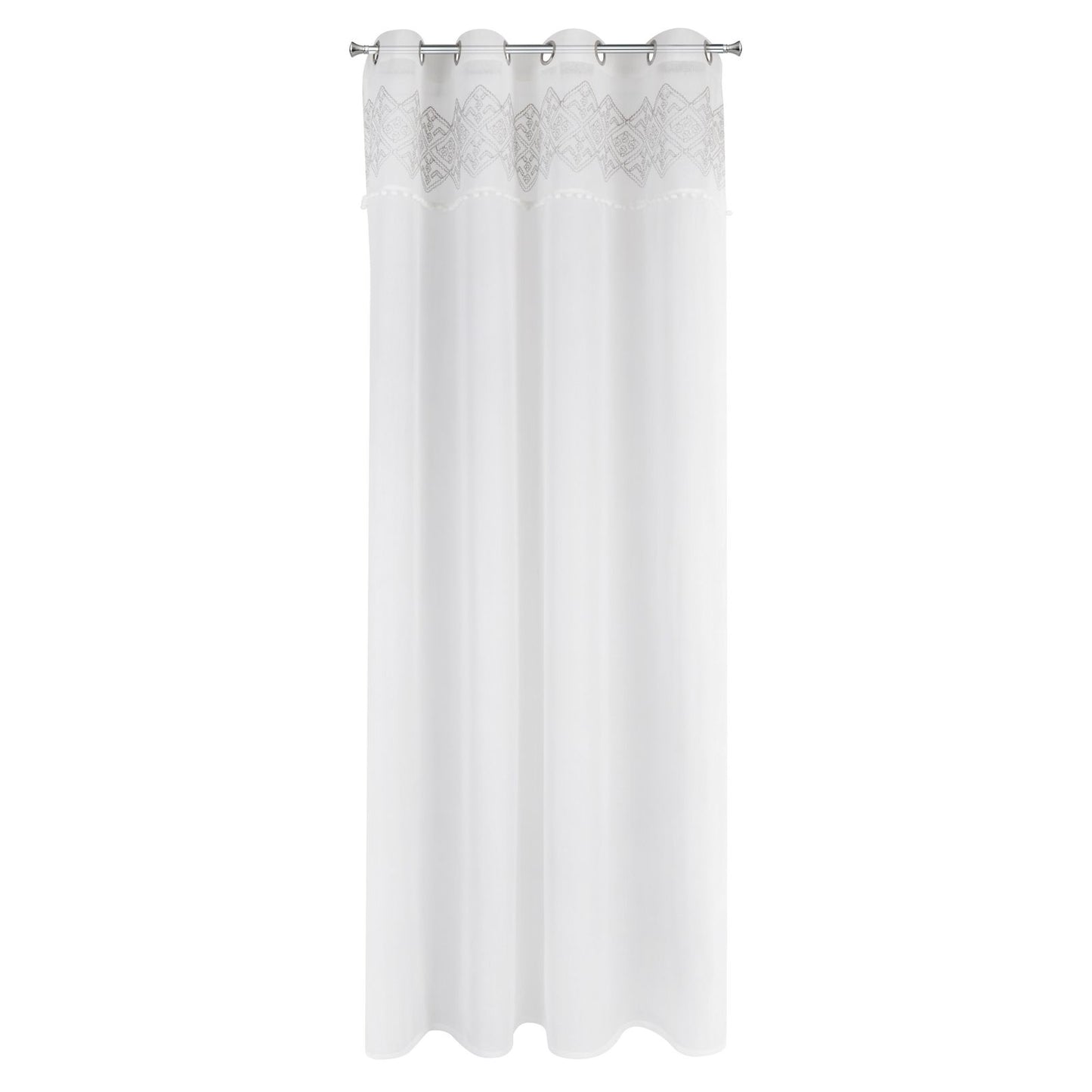 Delikāts logu rotājums, kurā apvienots tradicionālais un modernais dizains. Aizkara augšdaļu rotā smalks izšuvums sudraba krāsā ar ģeometrisku motīvu. Aizkaru apdare ar bumbuļiem. platums: 140 cm, garums: 250 cm, krāsa: balta, svars: 66 GSM, sastāvs: Sastāvs: 100% poliesteris.