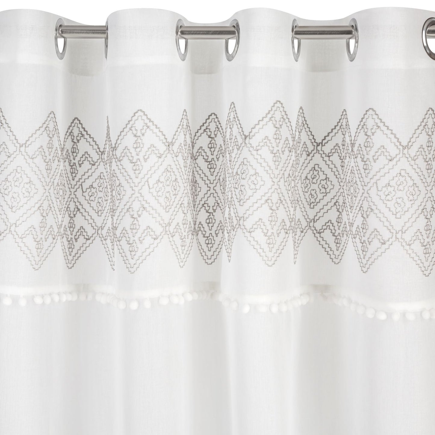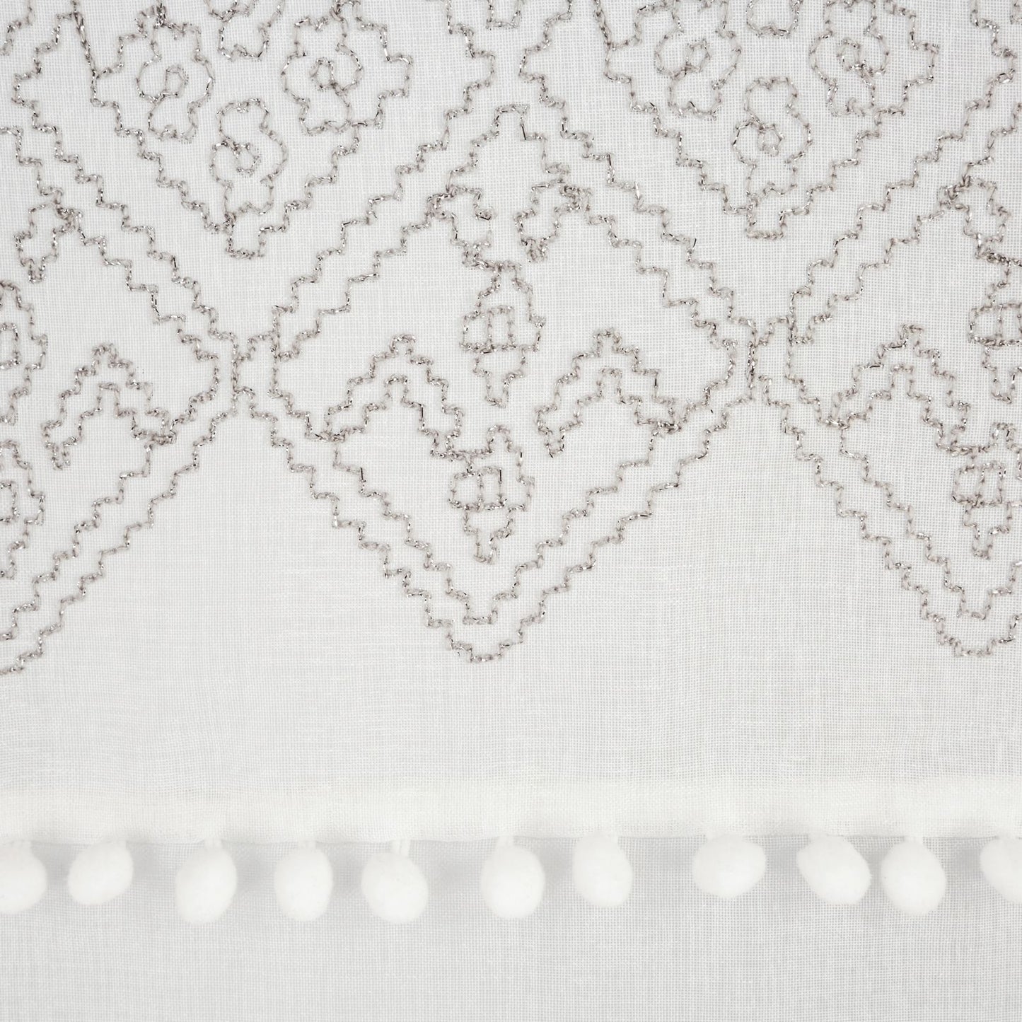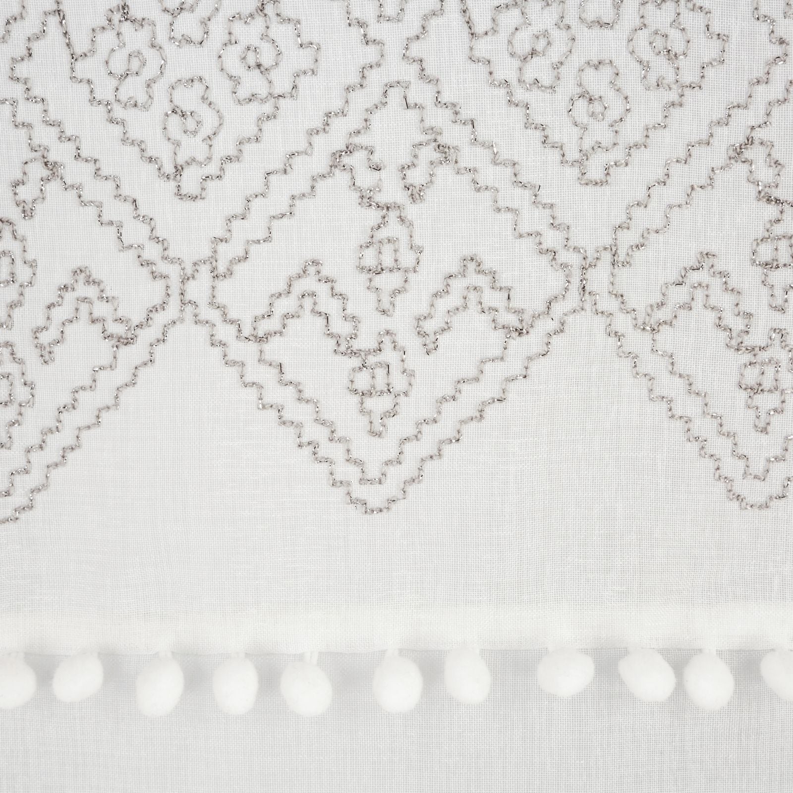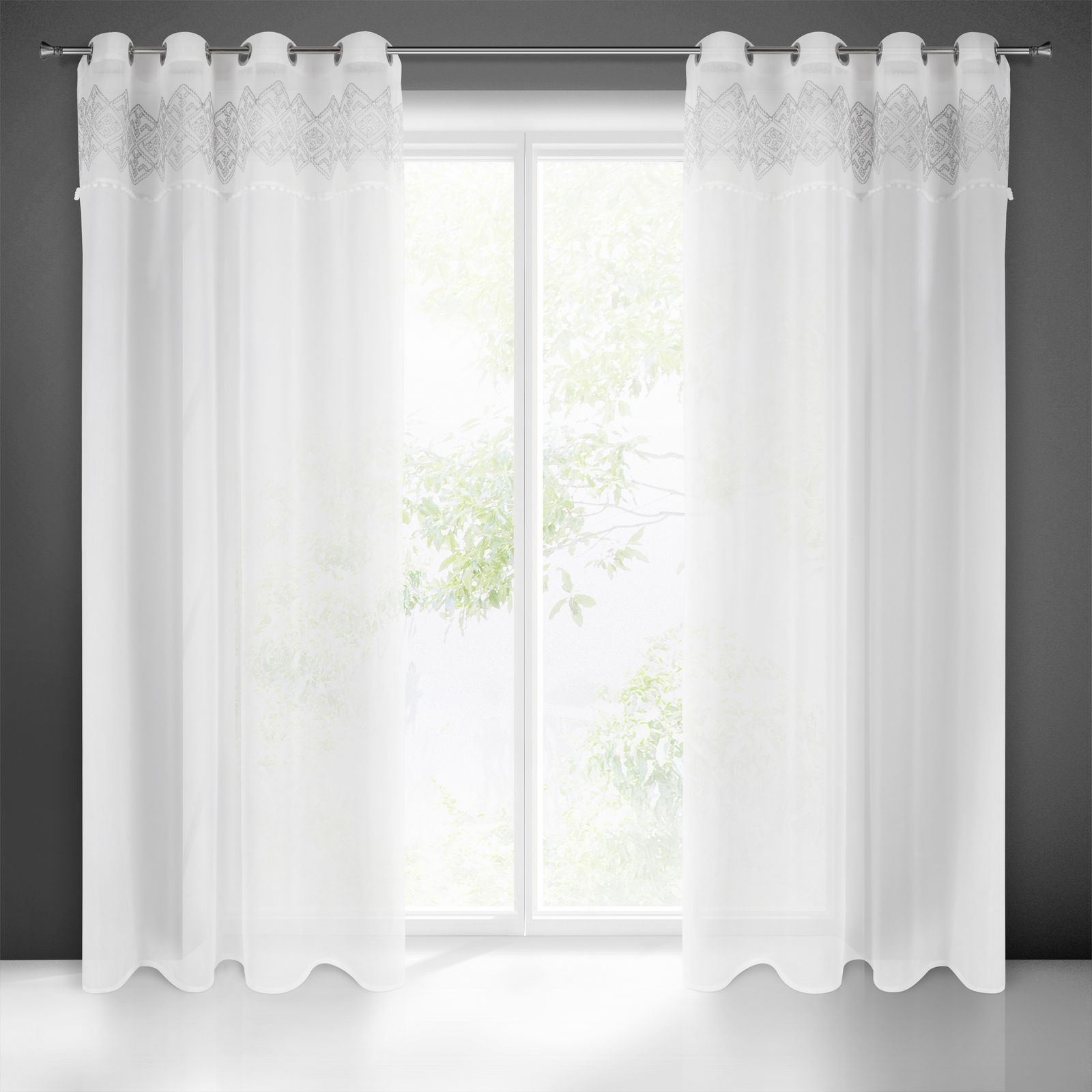 Delikāts logu rotājums, kurā apvienots tradicionālais un modernais dizains. Aizkara augšdaļu rotā smalks izšuvums sudraba krāsā ar ģeometrisku motīvu. Aizkaru apdare ar bumbuļiem. platums: 140 cm, garums: 250 cm, krāsa: balta, svars: 66 GSM, sastāvs: Sastāvs: 100% poliesteris.