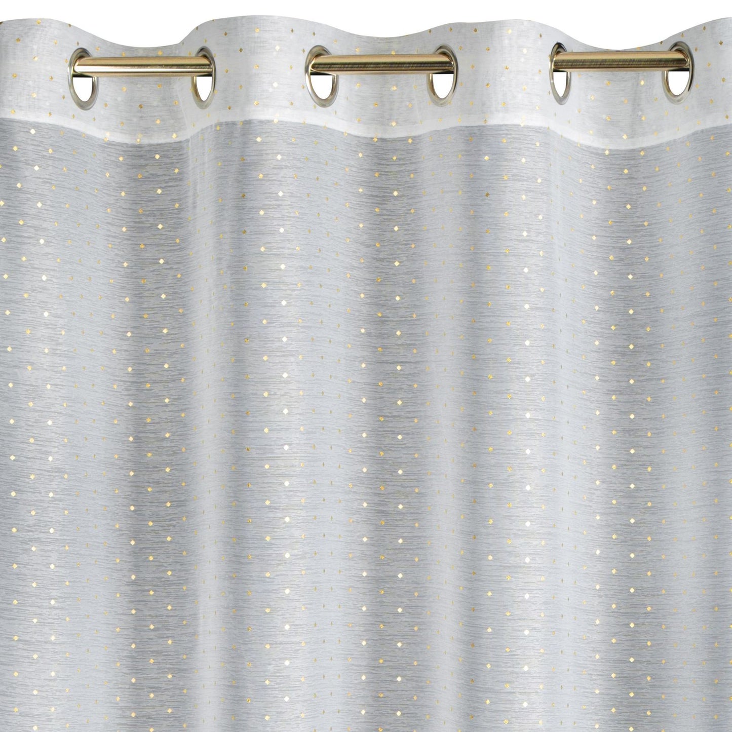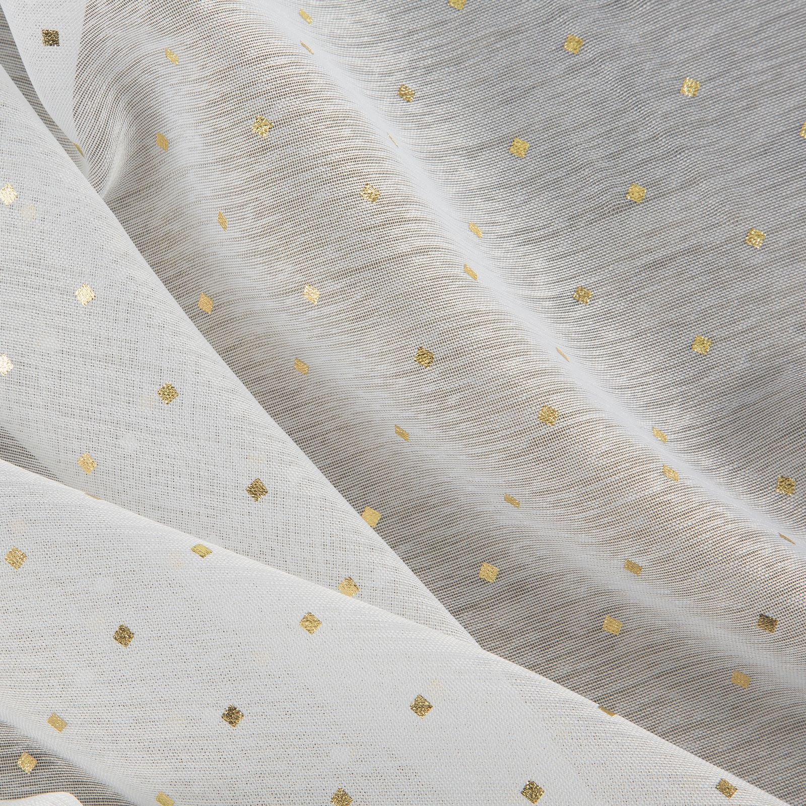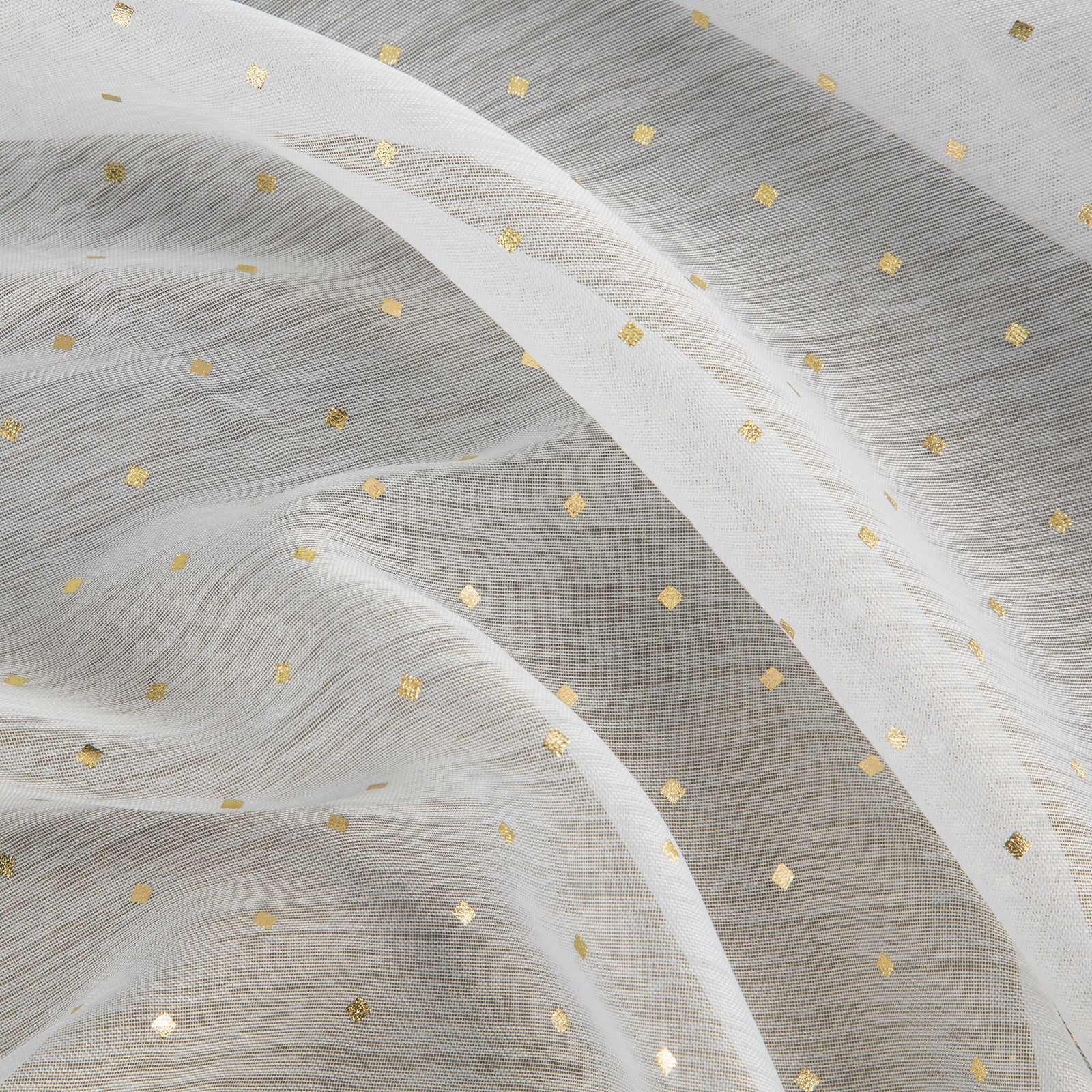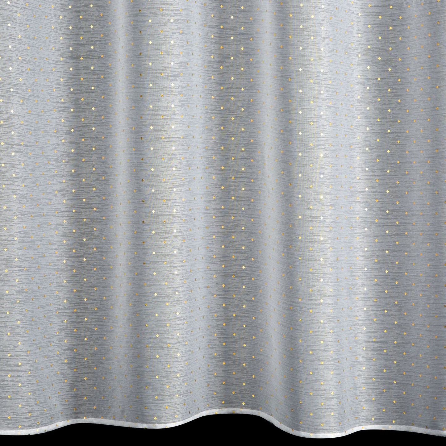 Mīksts aizkars, kas izgatavots no necaurspīdīga auduma un rotāts ar smalku zelta rombu apdruku. Lieliska gaismas izkliedēšana. Nepieciešama gludināšana kreisajā pusē. Platums: 140 cm, garums: 250 cm, krāsa: balta, svars: 50 GSM, sastāvs: Sastāvs: 100% poliesteris.