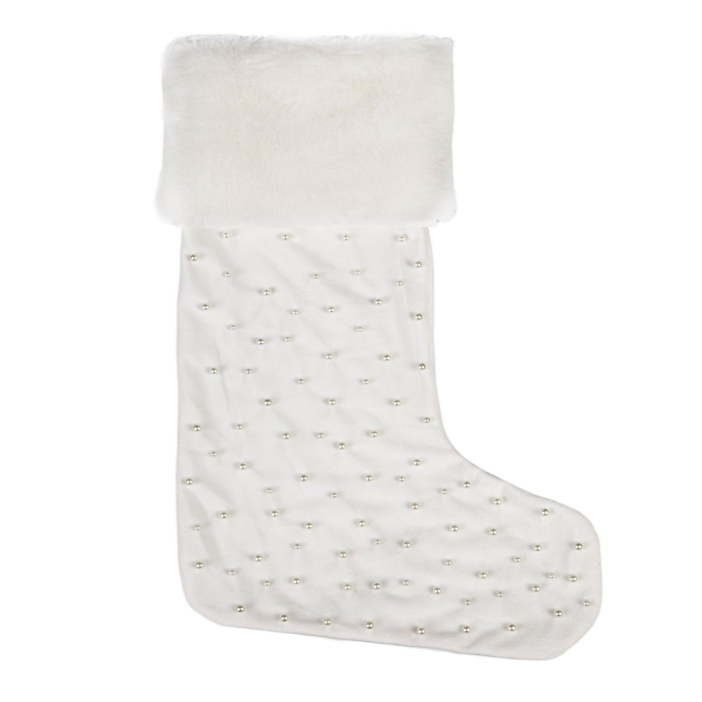 Samta zeķe ar kažokādu un piešūtām pērlēm platums: 25 cm, garums: 45 cm, krāsa: krēma, svars: 240 GSM, sastāvs: Materiāls: 100% poliesteris.