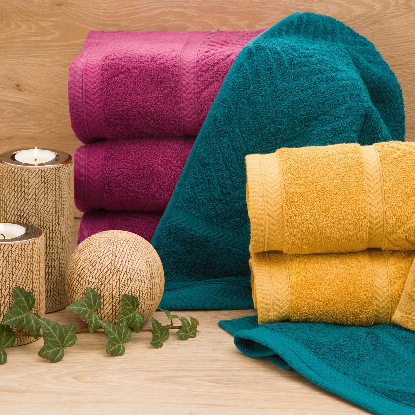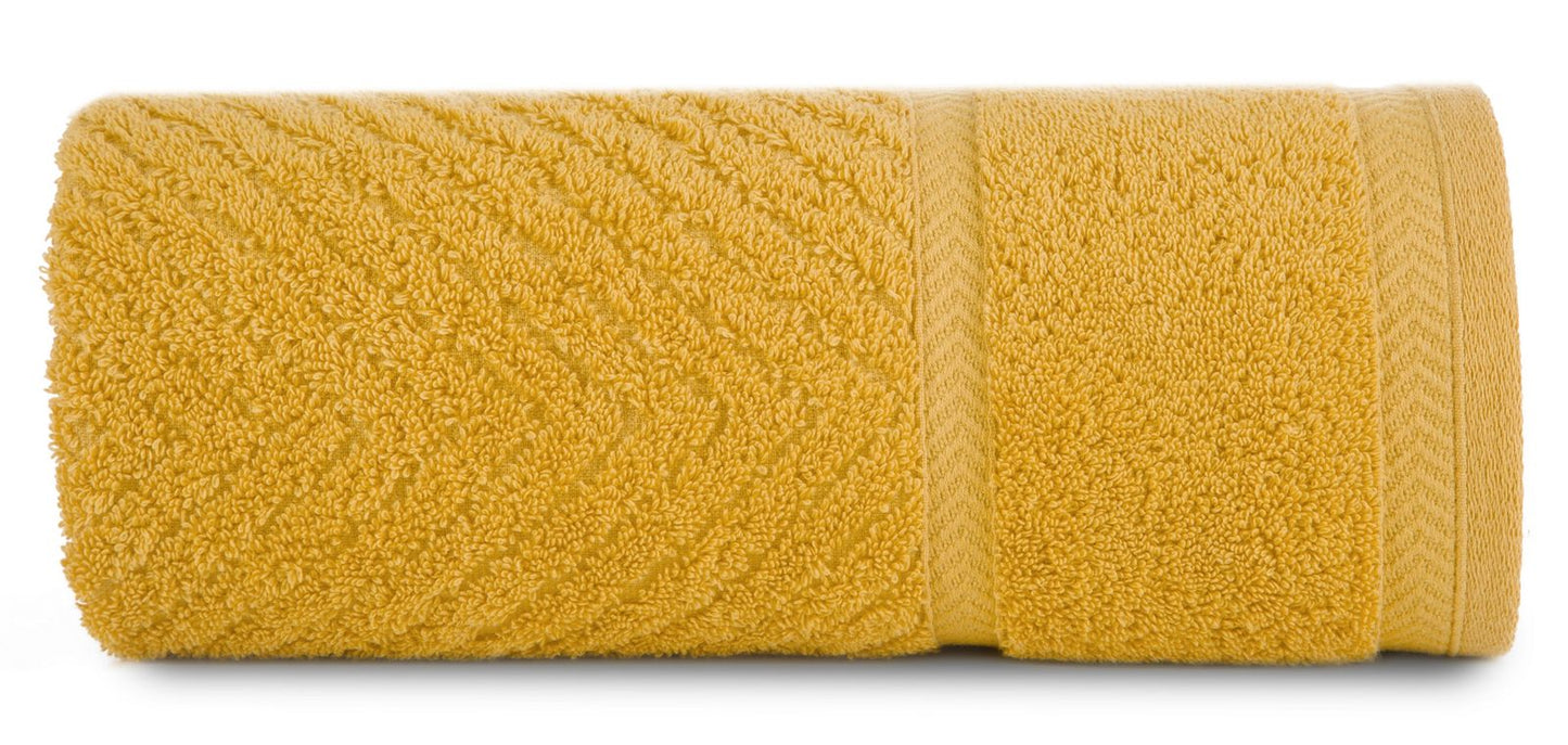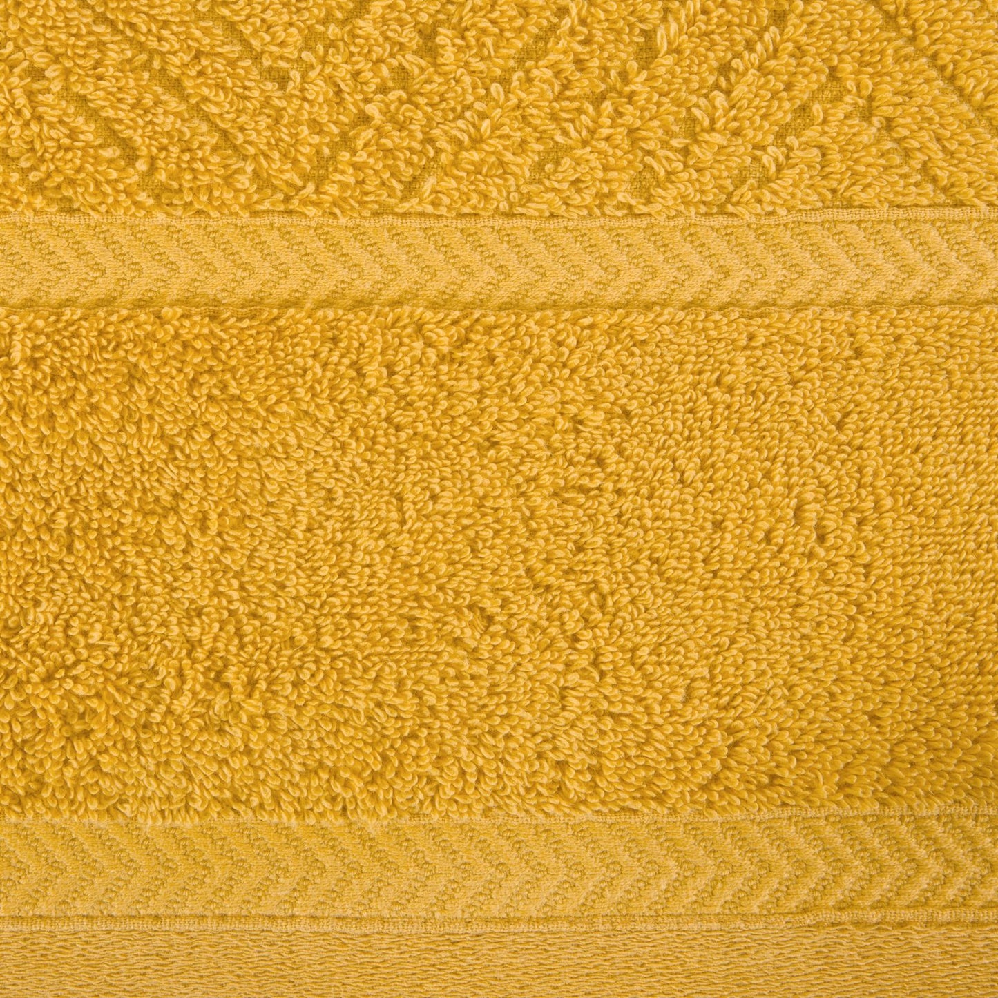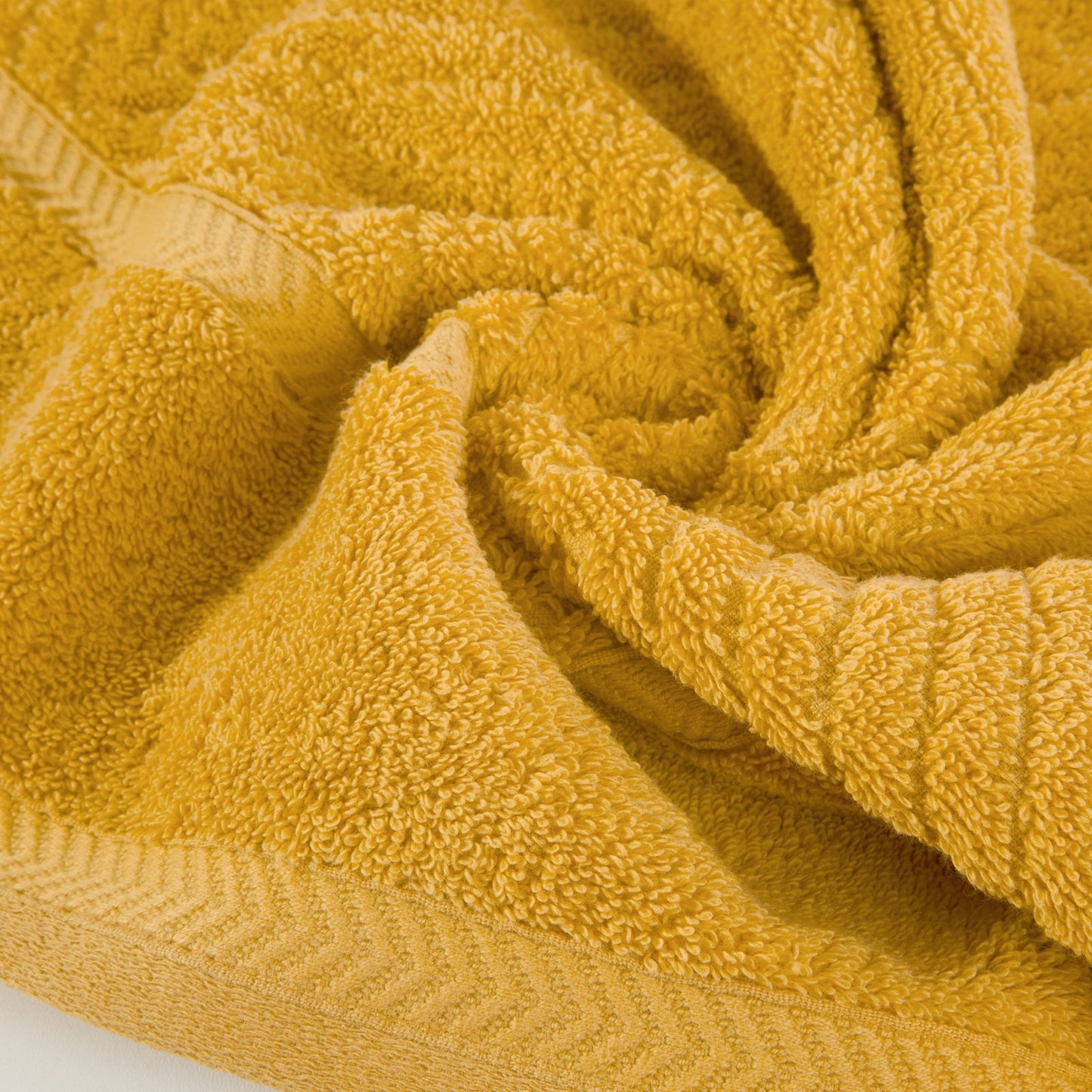 Dvieļu ar žakarda apmali zigzagos platums: 50 cm, garums: 90 cm, krāsa: sinepju, svars: 500 GSM, sastāvs: Materiāls: 100% kokvilna.