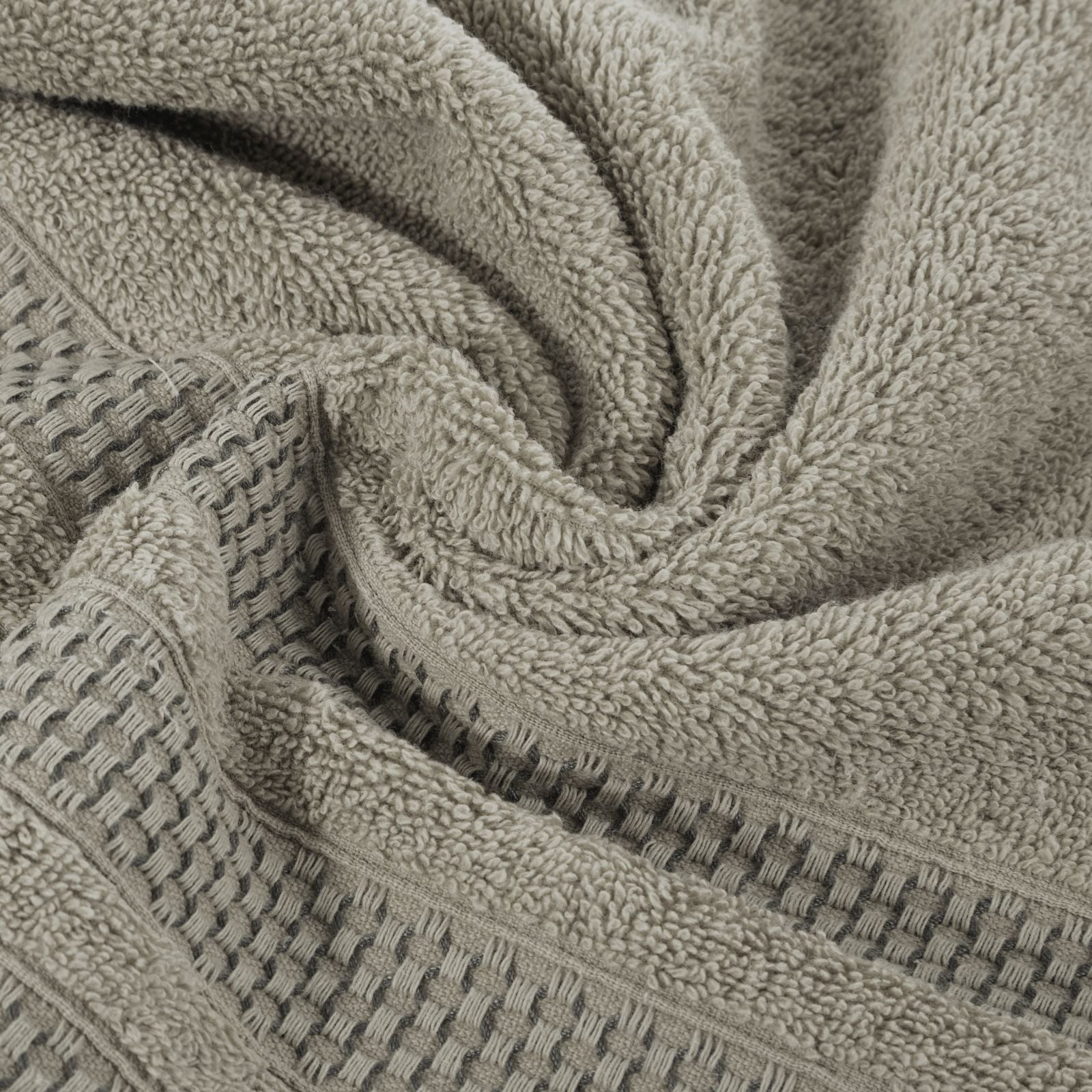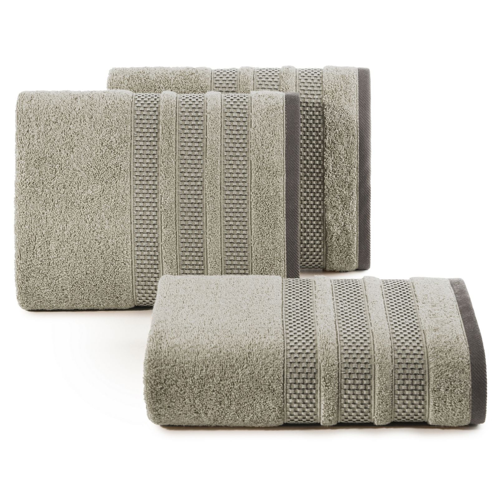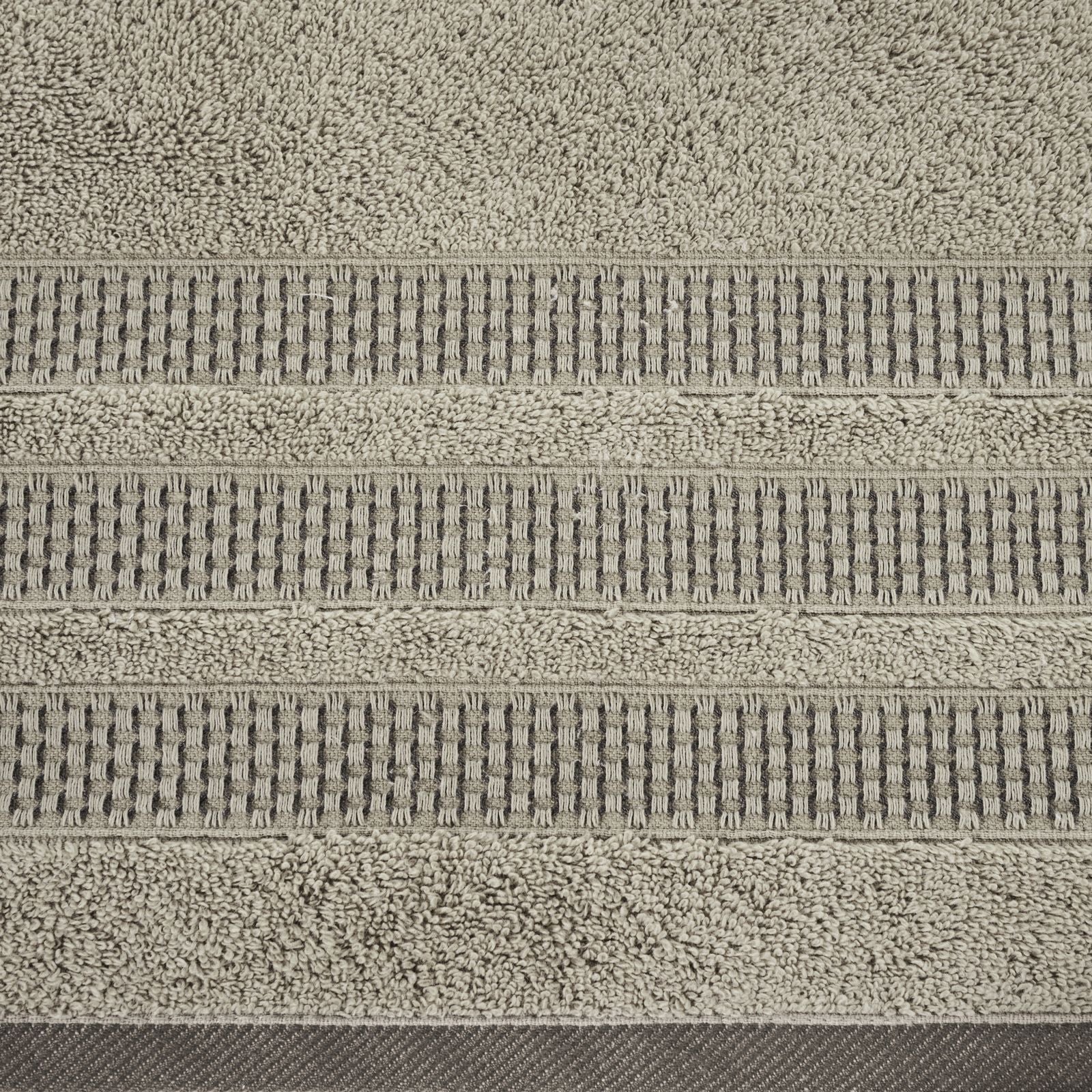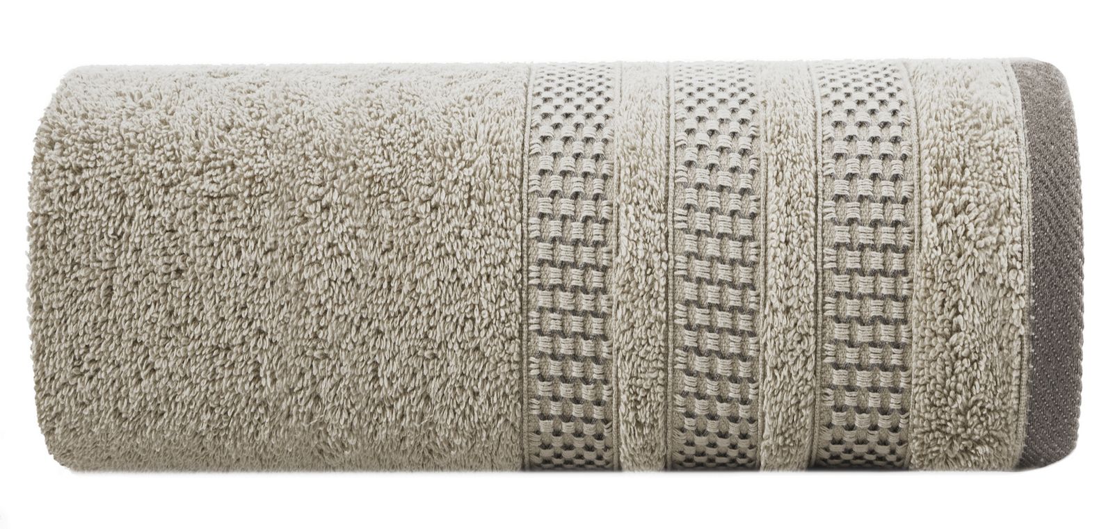 Dvieļu ar dekoratīvu svītrainu malu platums: 70 cm, garums: 140 cm, krāsa: tumši bēša, svars: 500 GSM, sastāvs: Sastāvs: 100% kokvilna; 96,5% kokvilna, 3,5% poliesters.