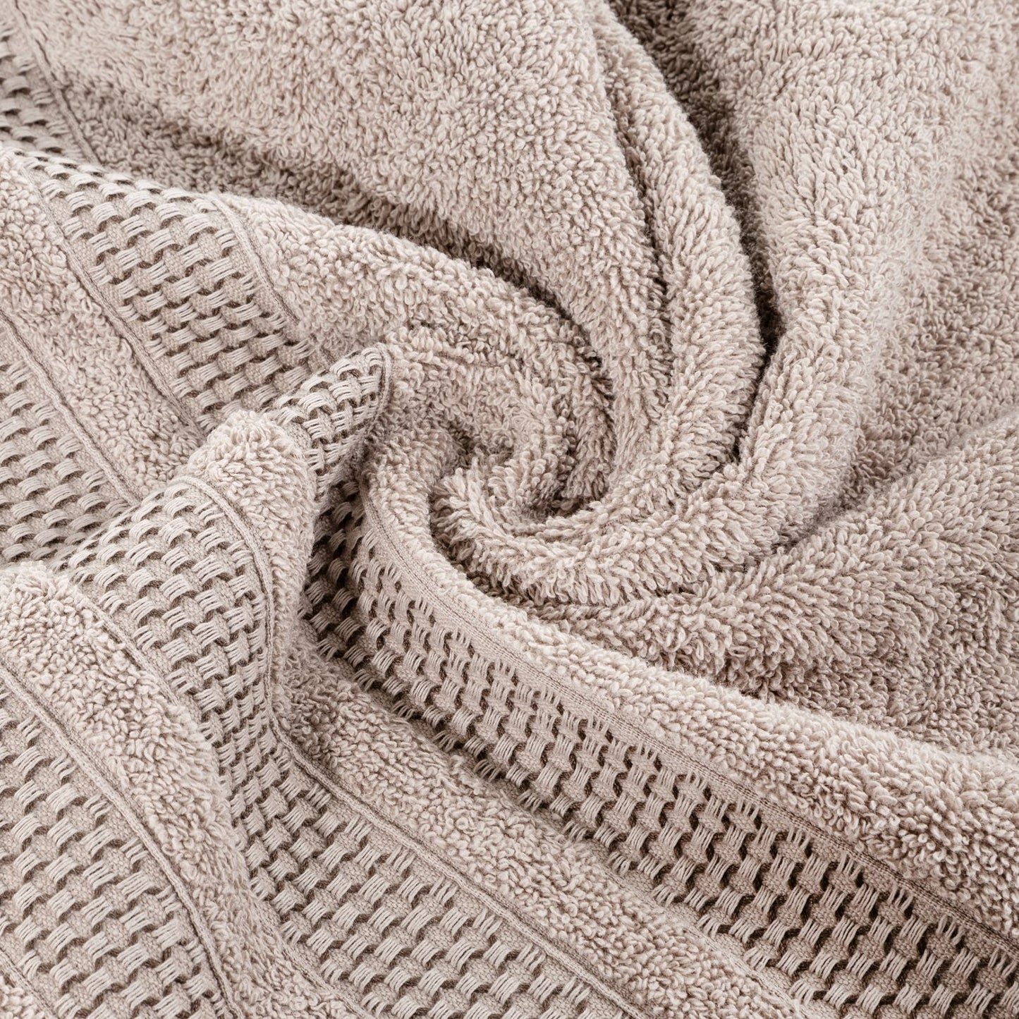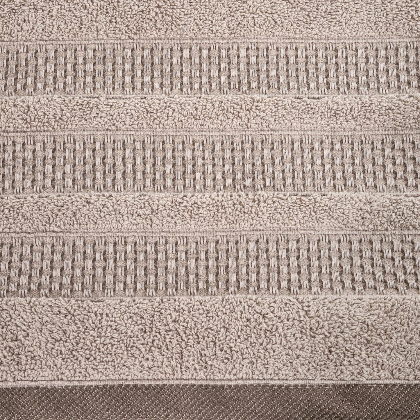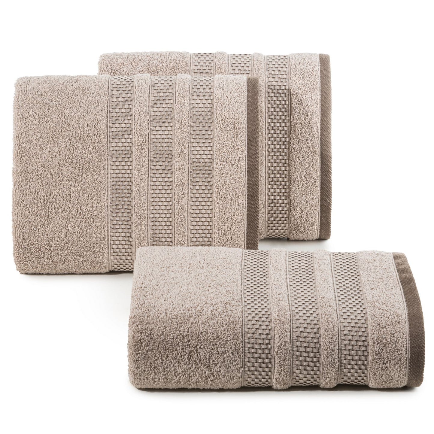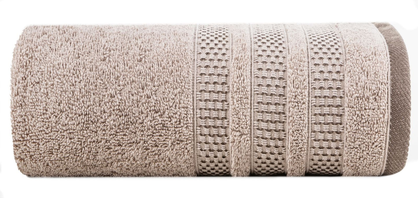 Dvieļu ar dekoratīvu svītrainu malu platums: 70 cm, garums: 140 cm, krāsa: bēša, svars: 500 GSM, sastāvs: Sastāvs: 100% kokvilna; 96,5% kokvilna, 3,5% poliesters.