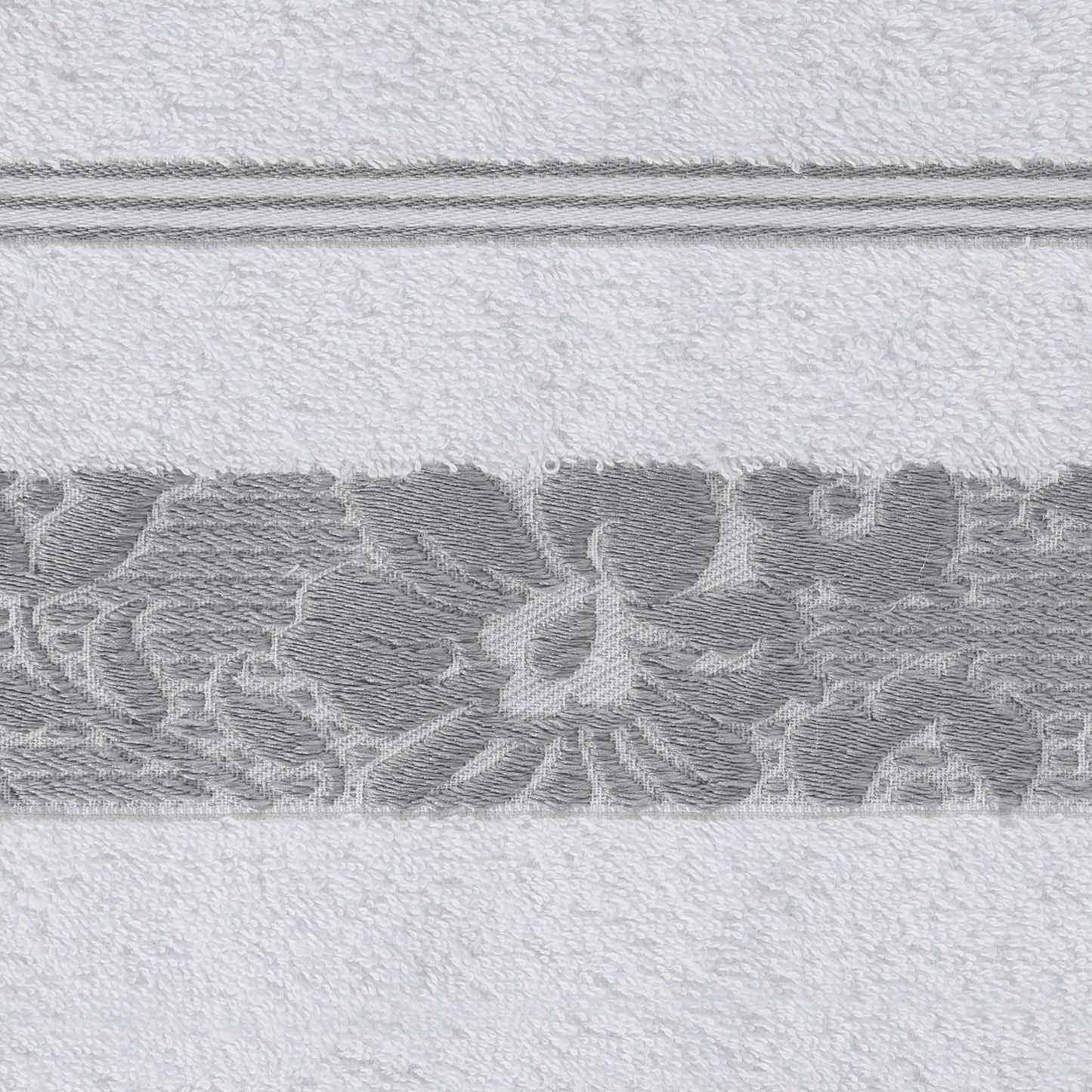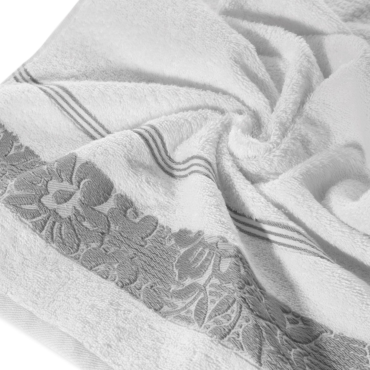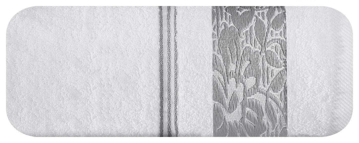 Elegants vannas dvielis no mīksta un uzsūcoša kokvilnas frotē, rotāts ar žakarda apmali ar ziedu rakstu atbilstošā krāsā. Ļoti mīksts un patīkams platums: 70 cm, garums: 140 cm, krāsa: balta, svars: 500 GSM, sastāvs: Sastāvs: 100% kokvilna; 70% poliesteris, 30% kokvilna.