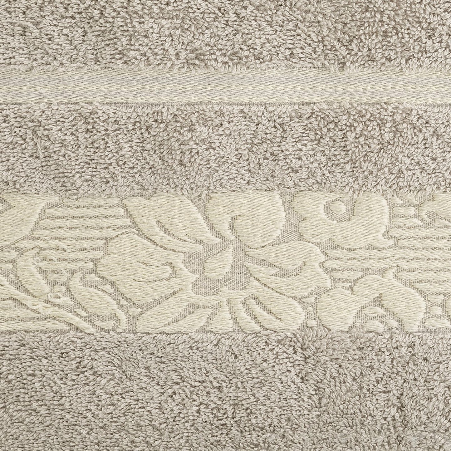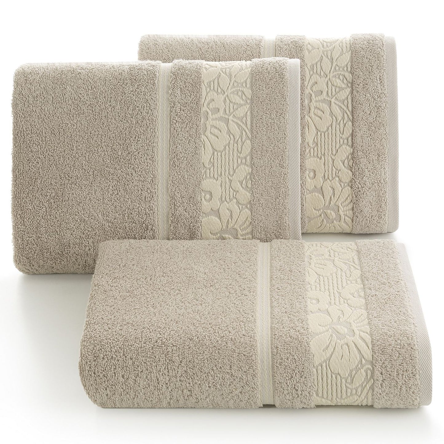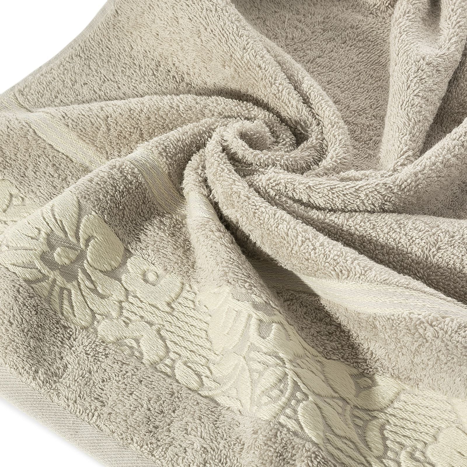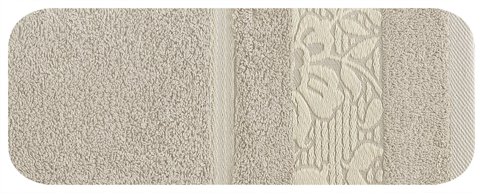 Elegants vannas dvielis no mīksta un uzsūcoša kokvilnas frotē, rotāts ar žakarda apmali ar ziedu rakstu atbilstošā krāsā. Ļoti mīksts un patīkams platums: 70 cm, garums: 140 cm, krāsa: bēša, svars: 500 GSM, sastāvs: Sastāvs: 100% kokvilna; 70% poliesteris, 30% kokvilna.