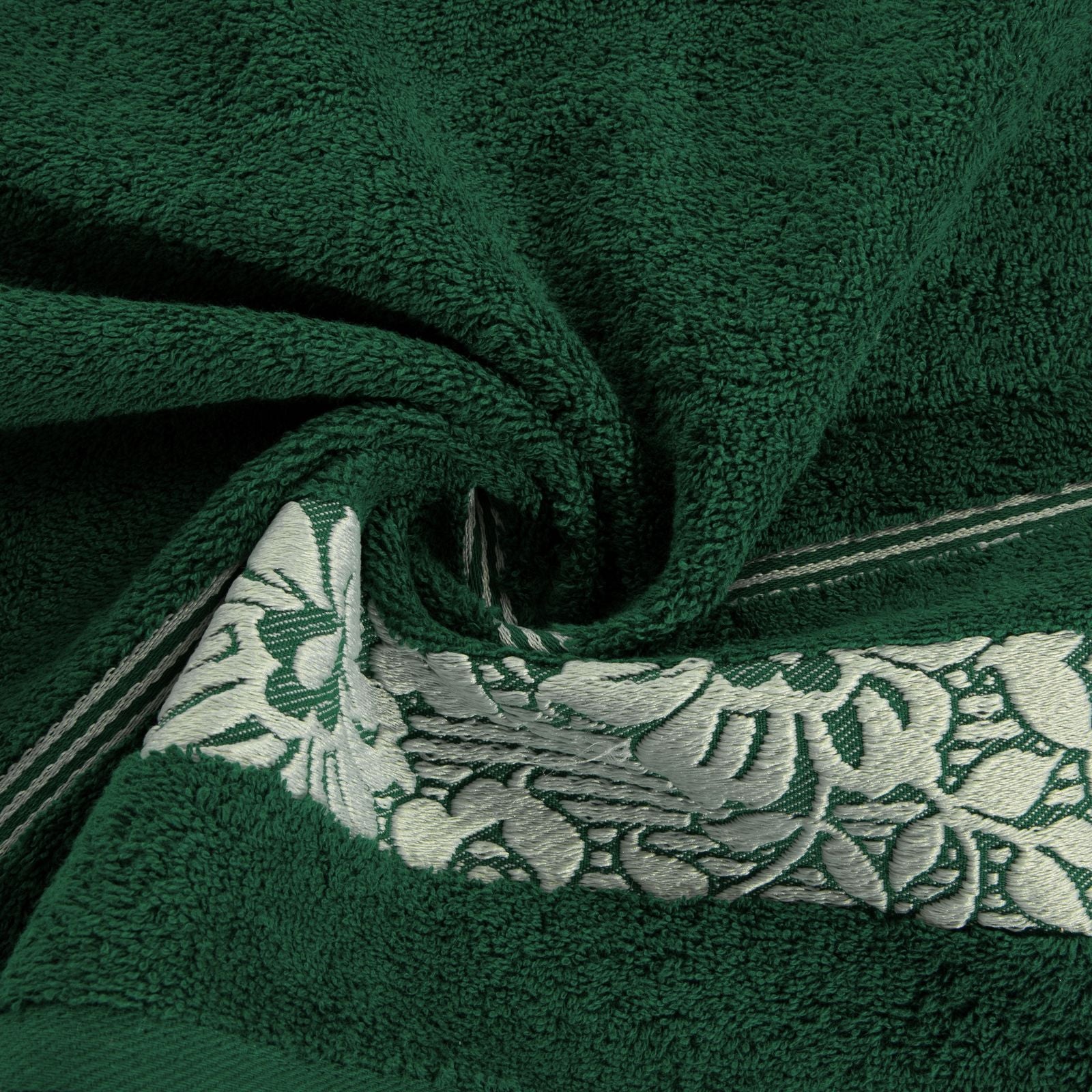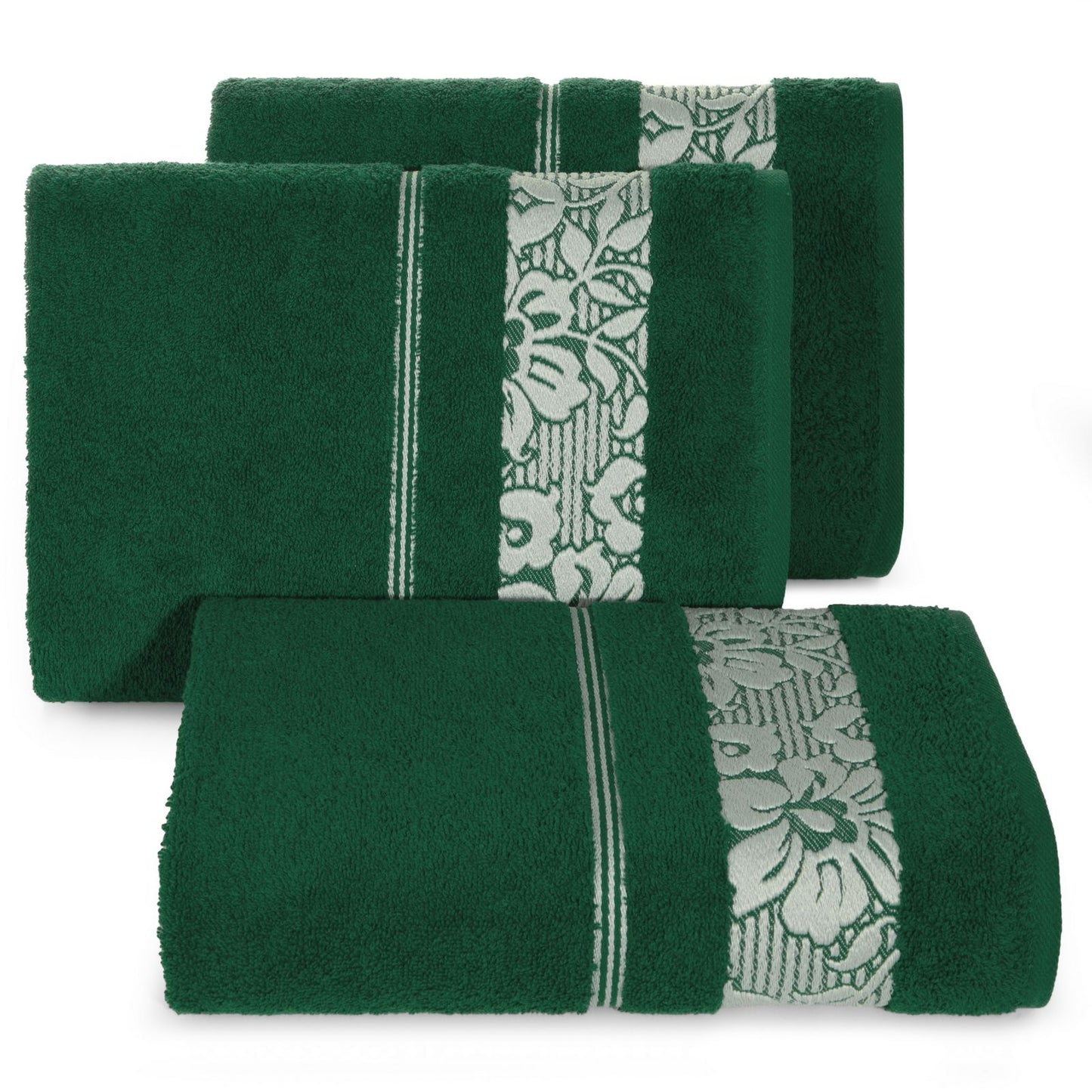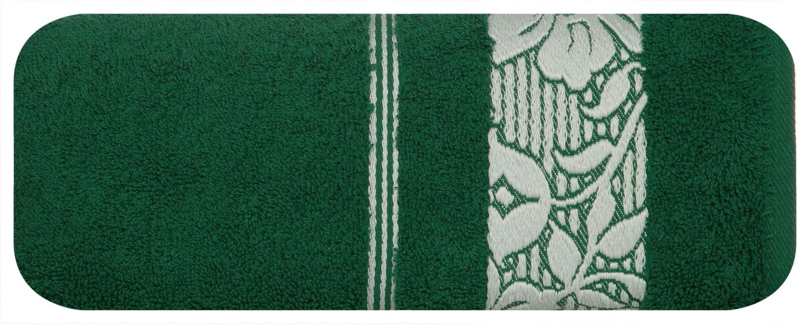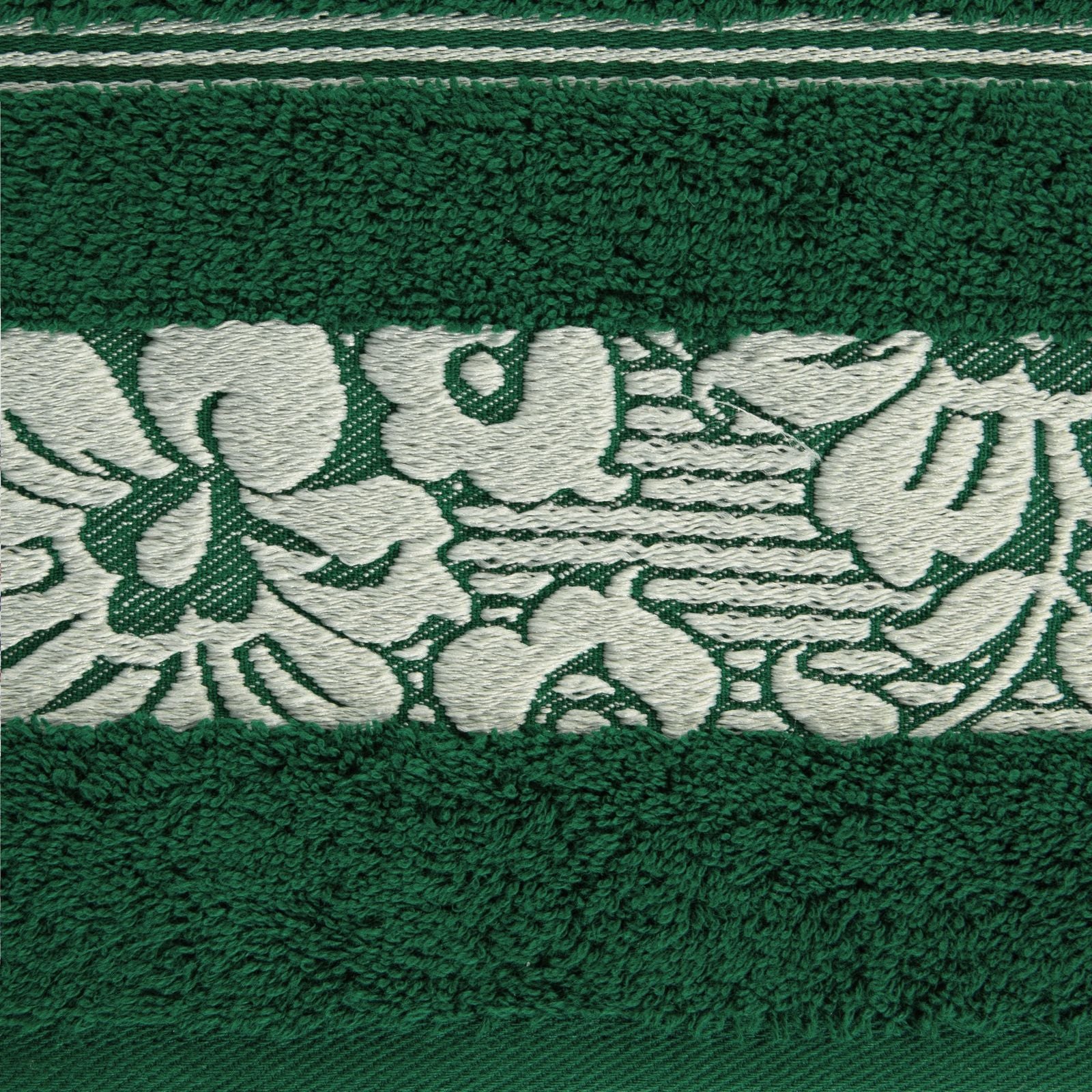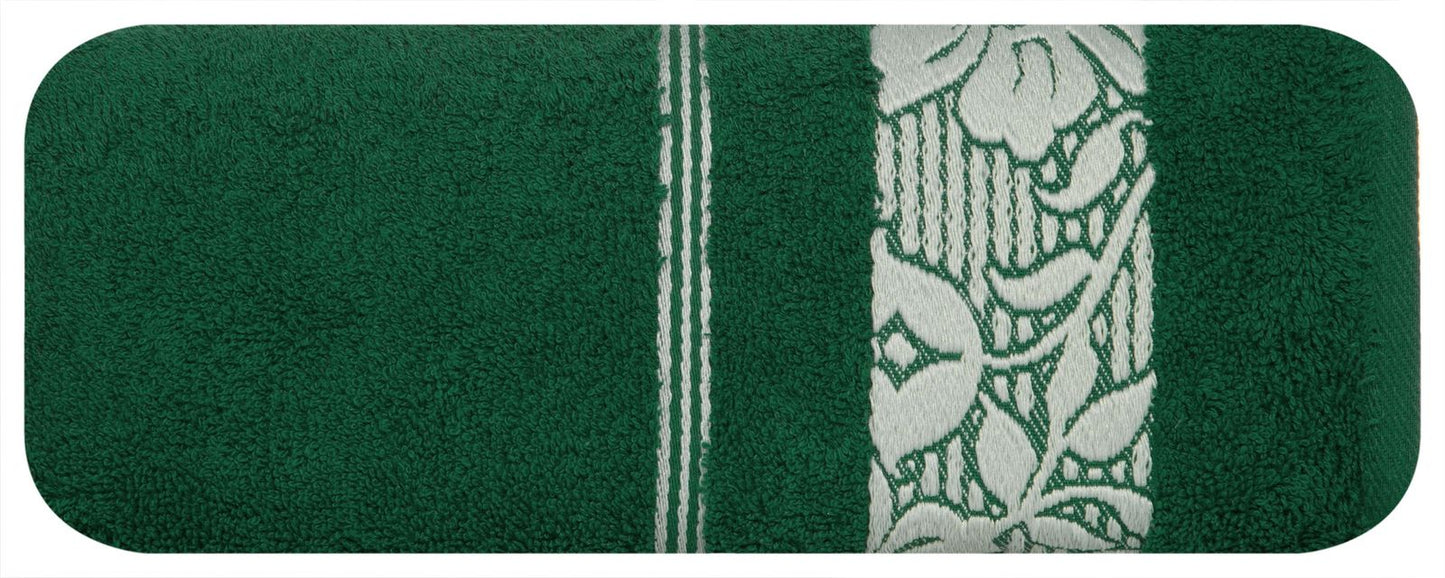 Elegants vannas dvielis no mīksta un uzsūcoša kokvilnas frotē, rotāts ar žakarda apmali ar ziedu rakstu atbilstošā krāsā. Ļoti mīksts un patīkams platums: 70 cm, garums: 140 cm, krāsa: tumši zaļa, svars: 500 GSM, sastāvs: Sastāvs: 100% kokvilna; 70% poliesteris, 30% kokvilna.