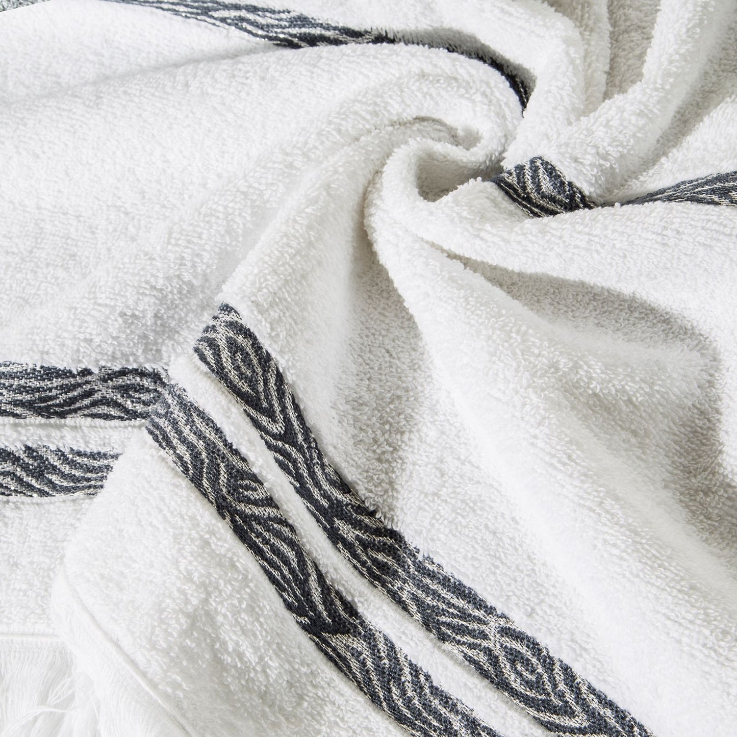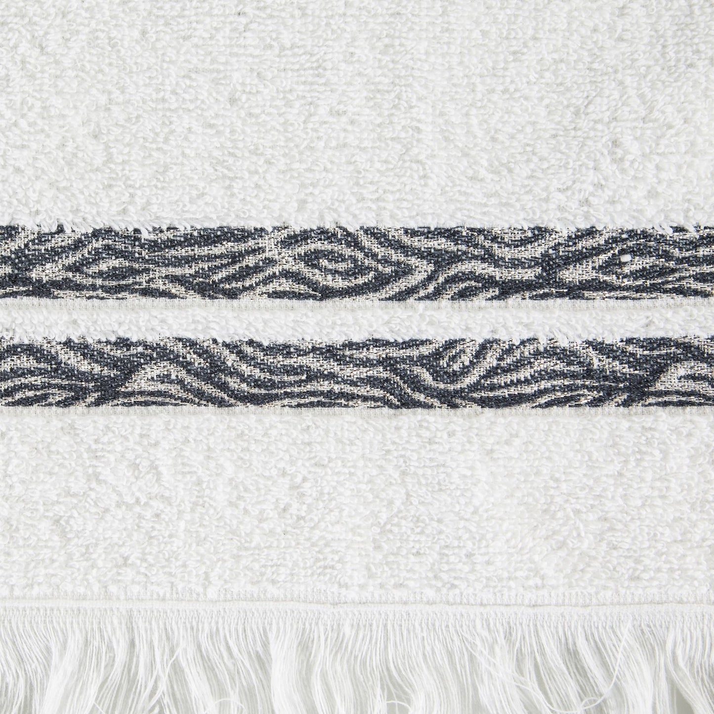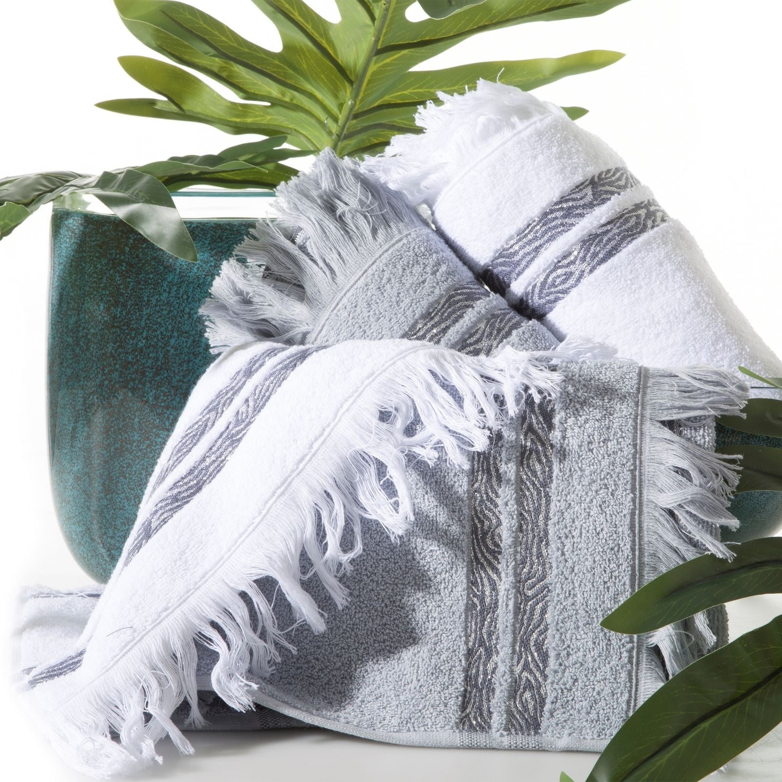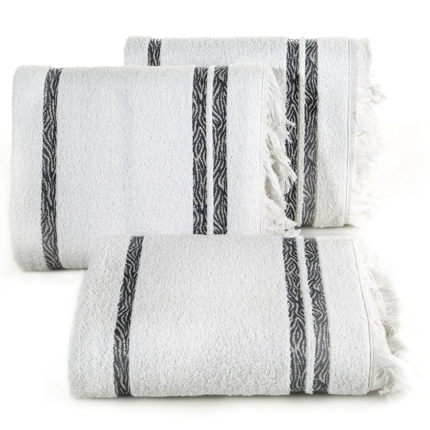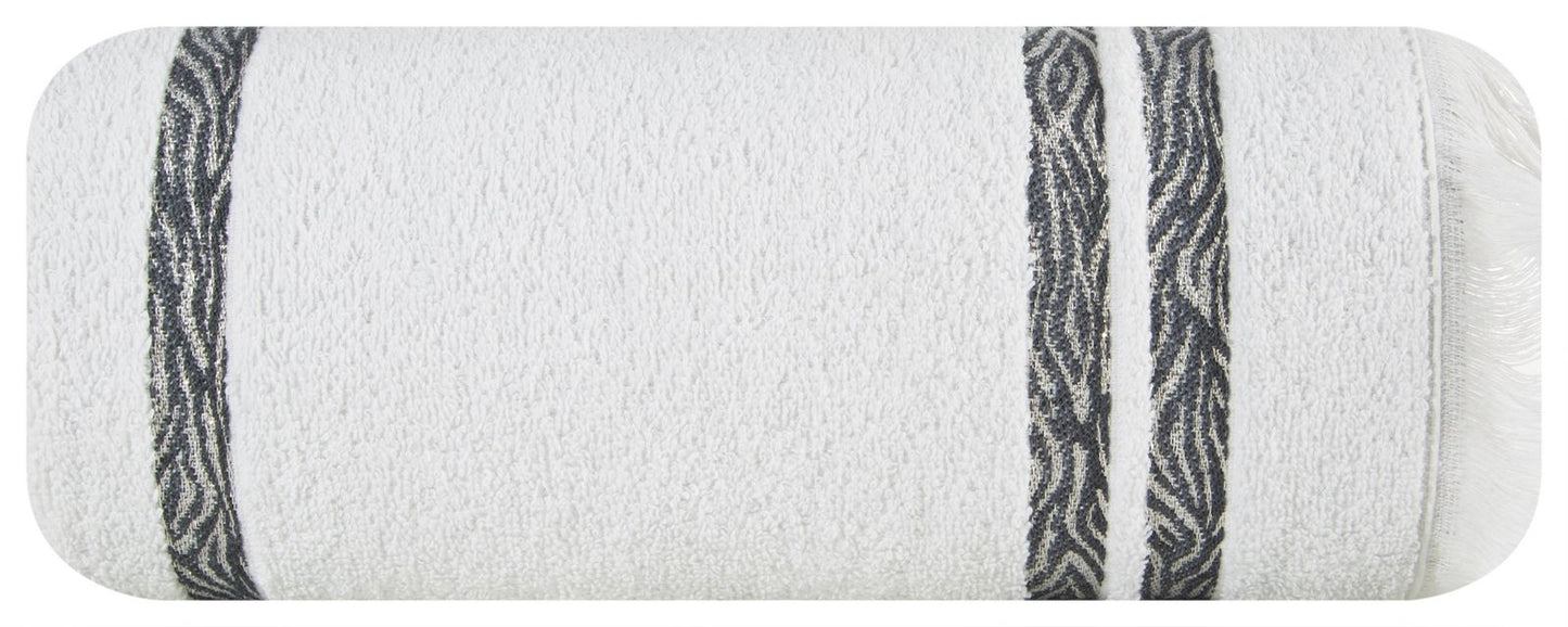 Mīksts un ļoti izteiksmīgs dvielis, kas izgatavots no uzsūcoša kokvilnas frotē, rotāts ar žakarda plānu apdari ar mirdzošiem diegiem un apdari ar īsām bārkstīm. platums: 70 cm, garums: 140 cm, krāsa: balta, svars: 485 GSM, sastāvs: Sastāvs: 100% kokvilna; 95% kokvilna, 5% poliesteris.
