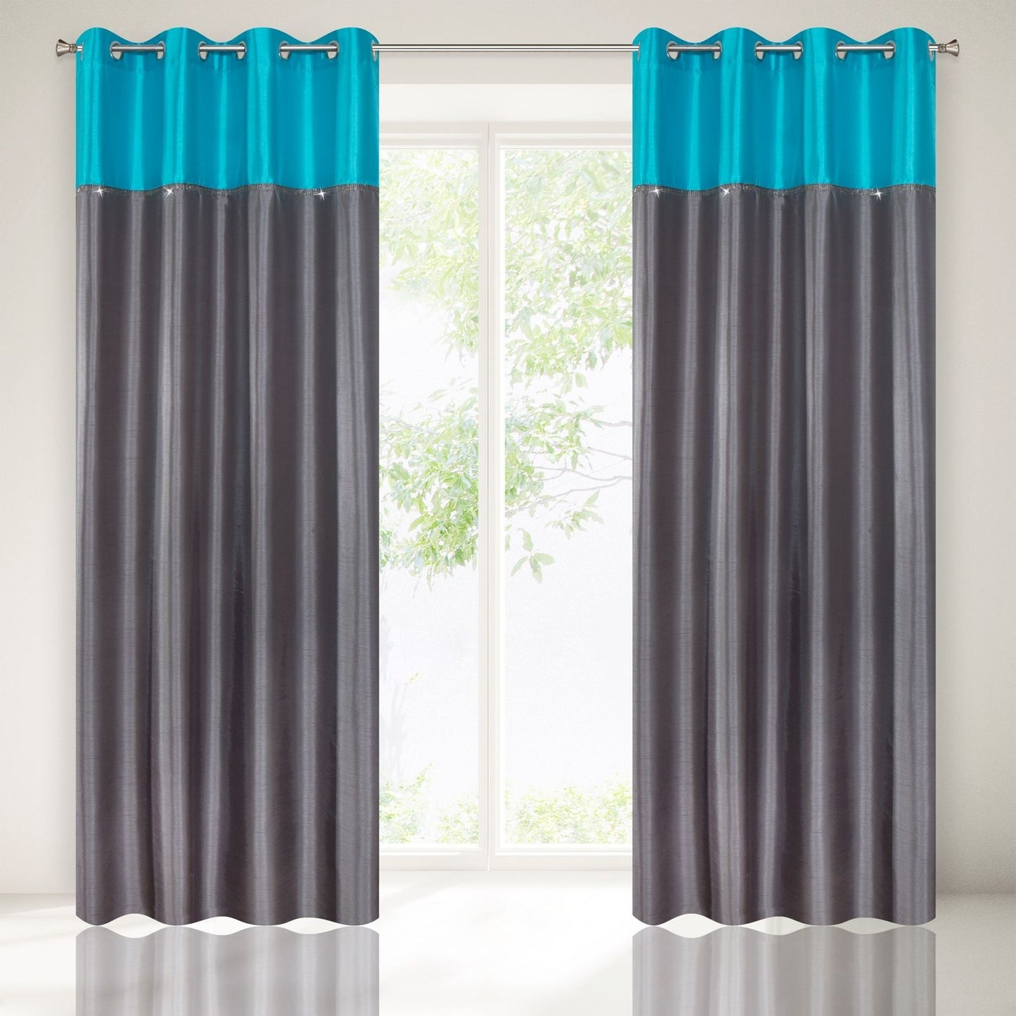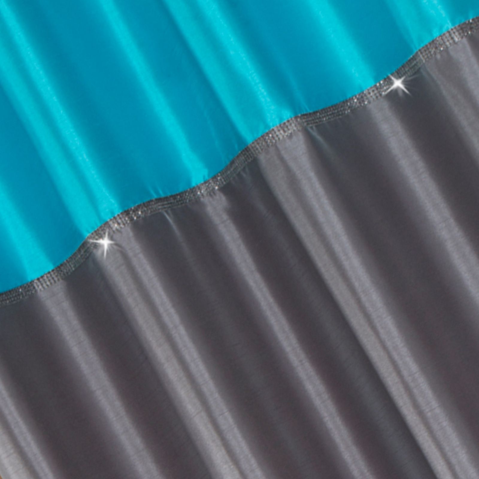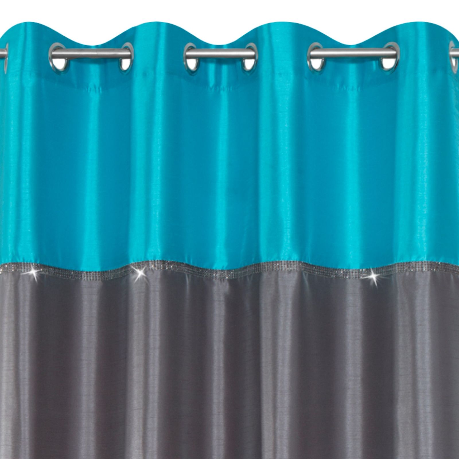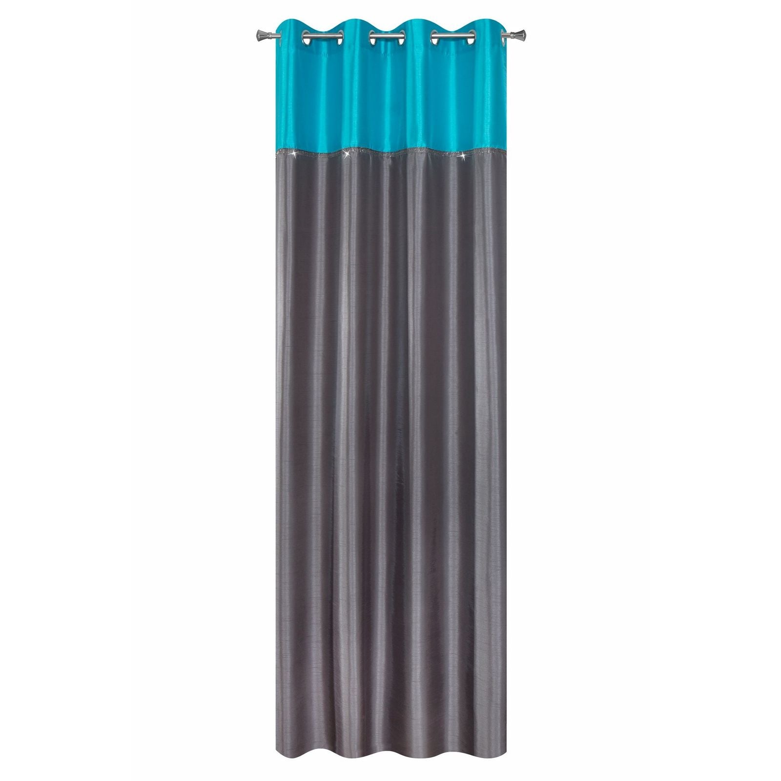 Aizkars šūts no satīna auduma, dekorēts ar cirkonus imitējošu lenti, platums: 140 cm, garums: 250 cm, krāsa: tirkīza, sastāvs: Materiāls: 100% poliesteris.