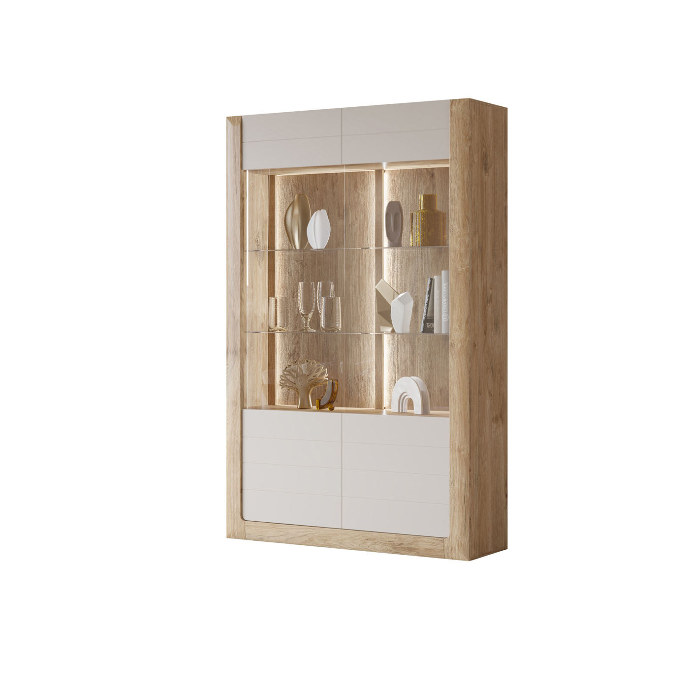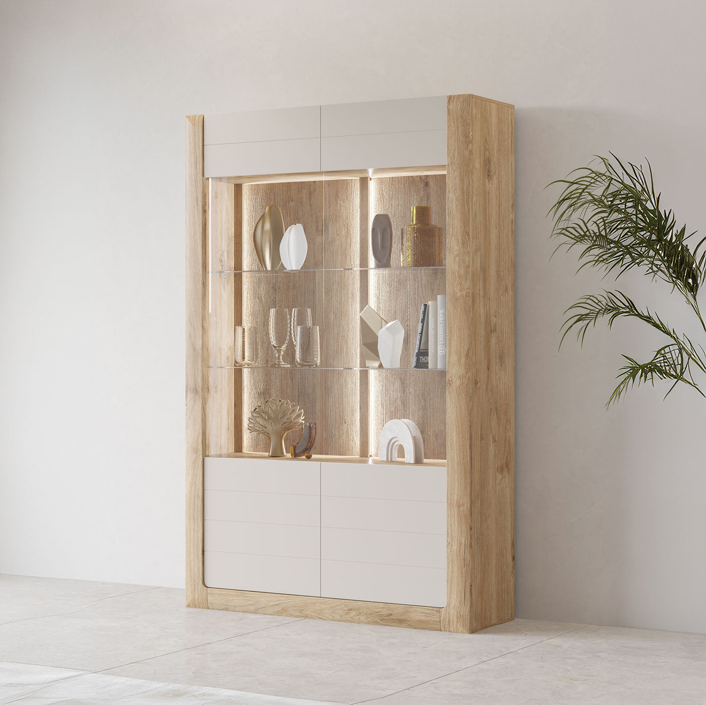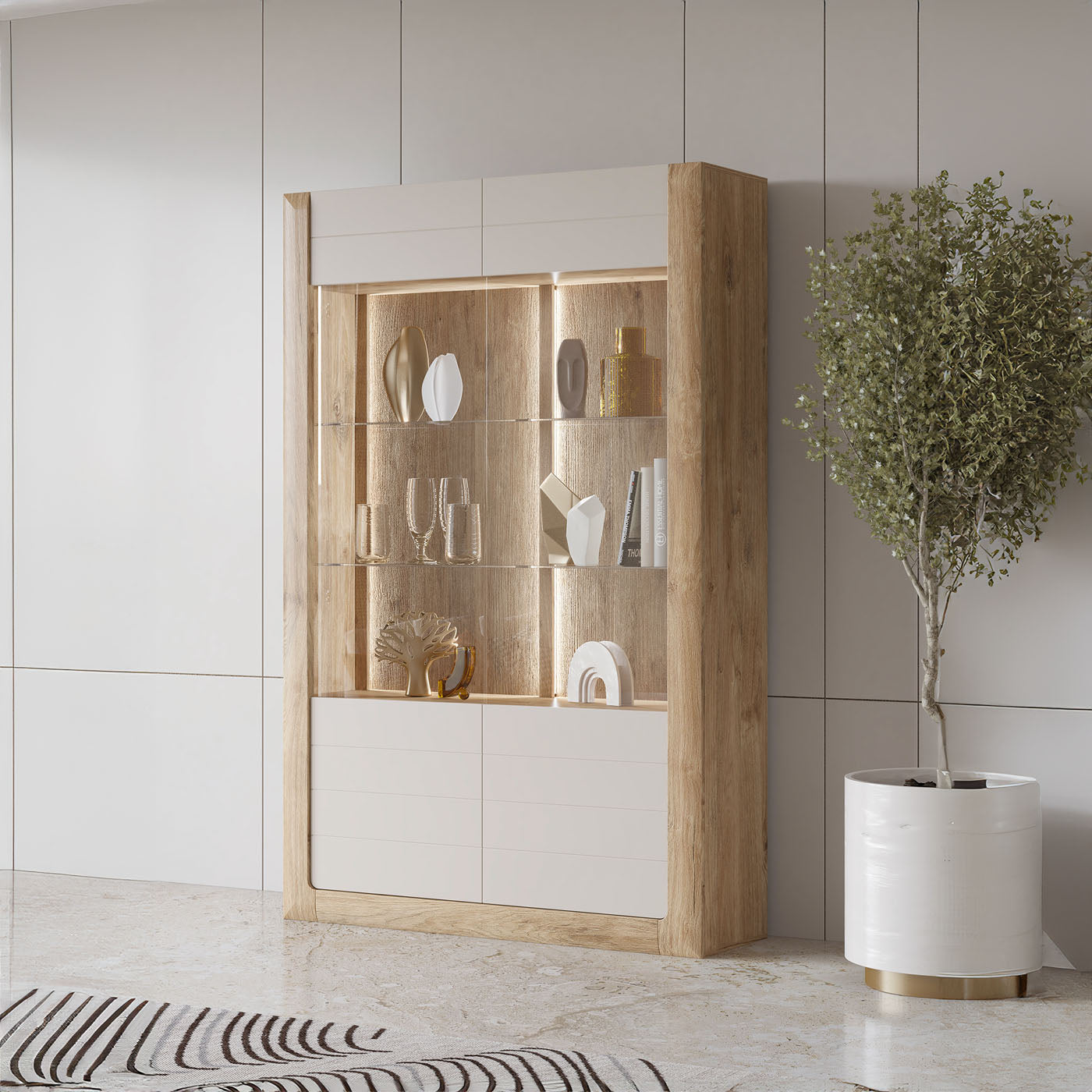 Vitrīnu skapīšu durvis ir izgatavotas no rūdīta stikla, piešķirot elegantu, modernu pieskārienu, vienlaikus uzlabojot mēbeļu drošību un izturību.