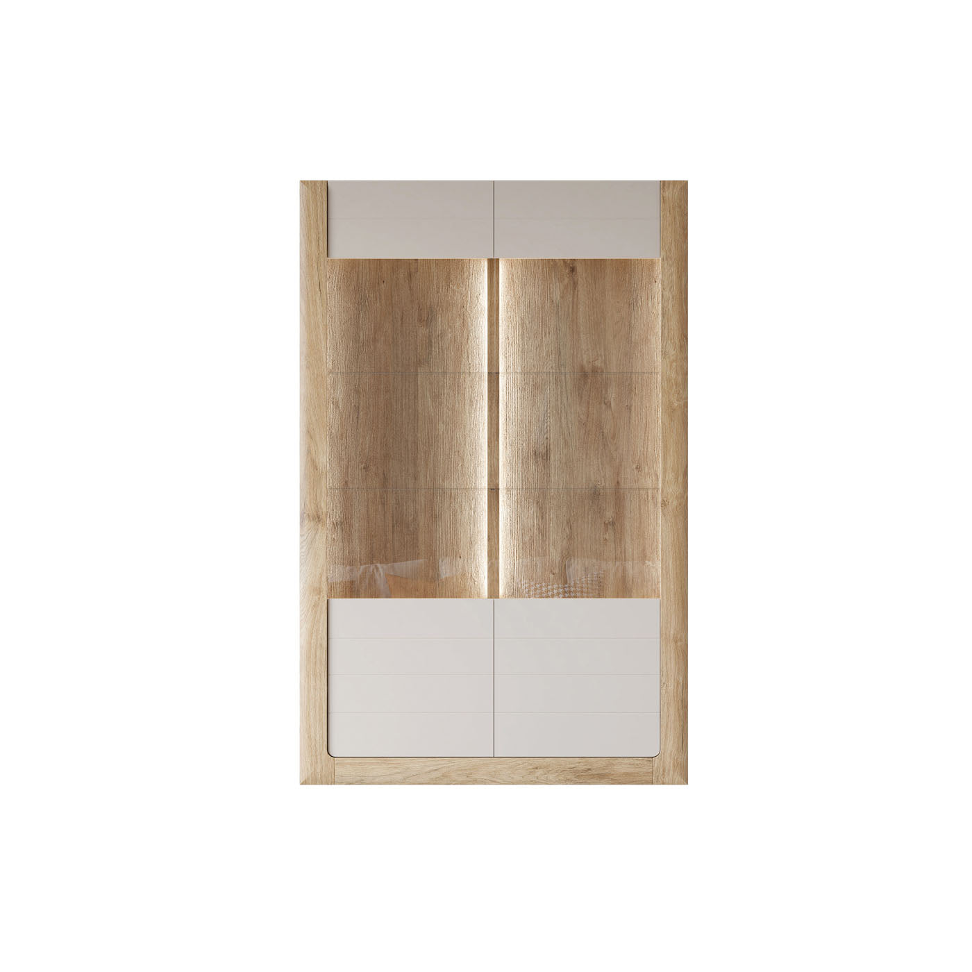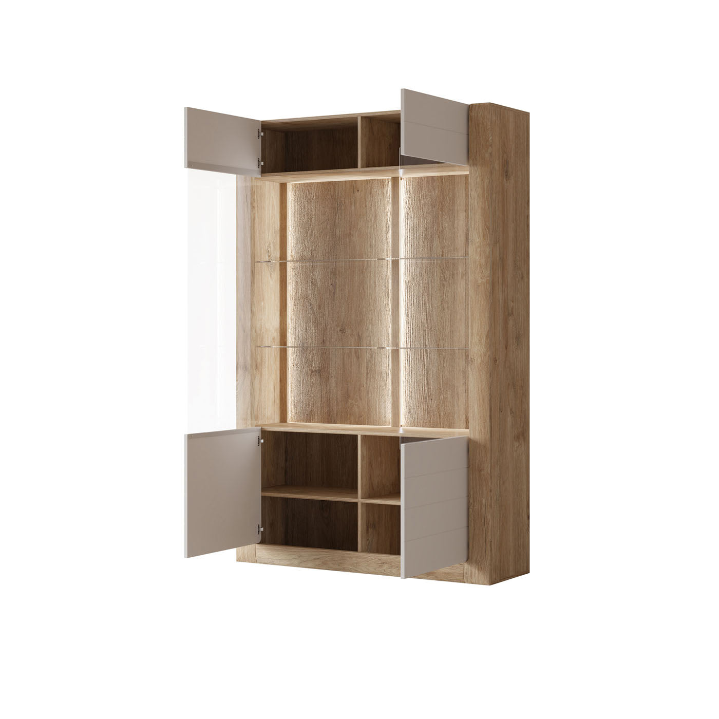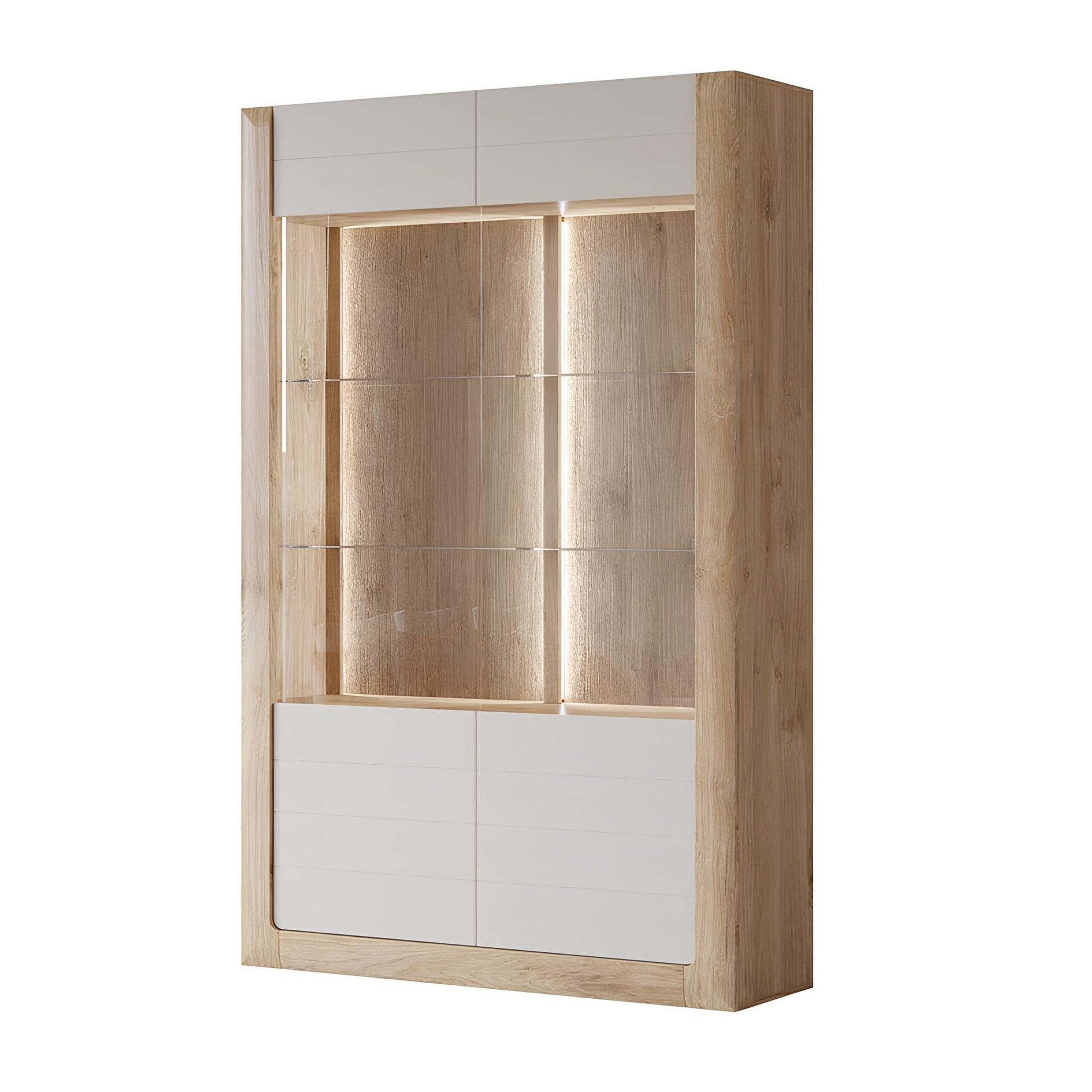 Vitrīnu skapīšu durvis ir izgatavotas no rūdīta stikla, piešķirot elegantu, modernu pieskārienu, vienlaikus uzlabojot mēbeļu drošību un izturību.