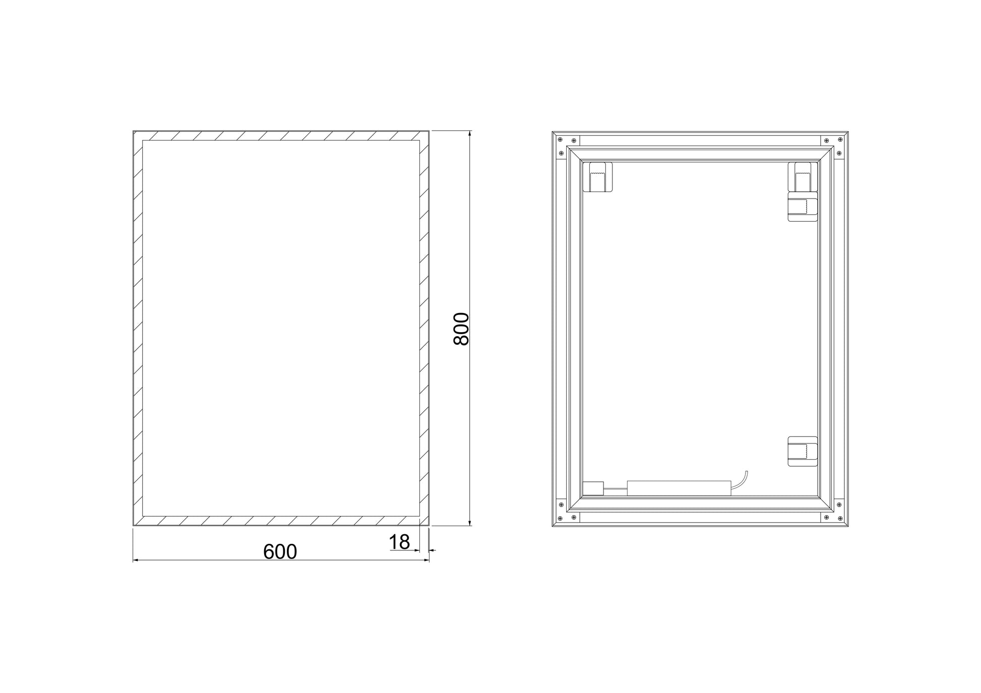 Taisnstūra spogulis ar noapaļotiem stūriem alumīnija rāmī. 1,8 cm platā perimetra josla ir apgaismota ar LED diodēm. Var pakārt vertikāli vai horizontāli. Rāmja krāsa - matēti melna.